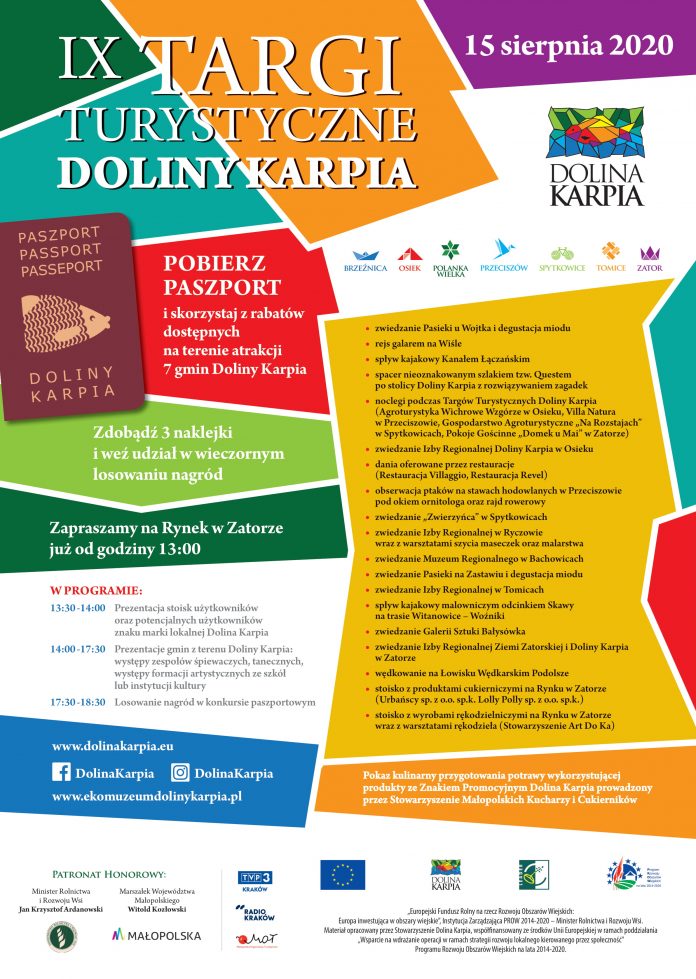 Zapraszamy na IX Targi Turystyczne Doliny Karpia, które odbędą się 15 sierpnia 2020 roku na Rynku w Zatorze oraz na terenie każdej gminy Doliny Karpia. Podczas Targów wystawcami będą użytkownicy oraz potencjalni użytkownicy znaku Marki Lokalnej Dolina Karpia, rękodzielnicy, restauratorzy, hotelarze, właściciele łowisk wędkarskich, gospodarstw agroturystycznych, gospodarstw rybackich, organizacje pozarządowe oraz lokalna branża turystyczna.
