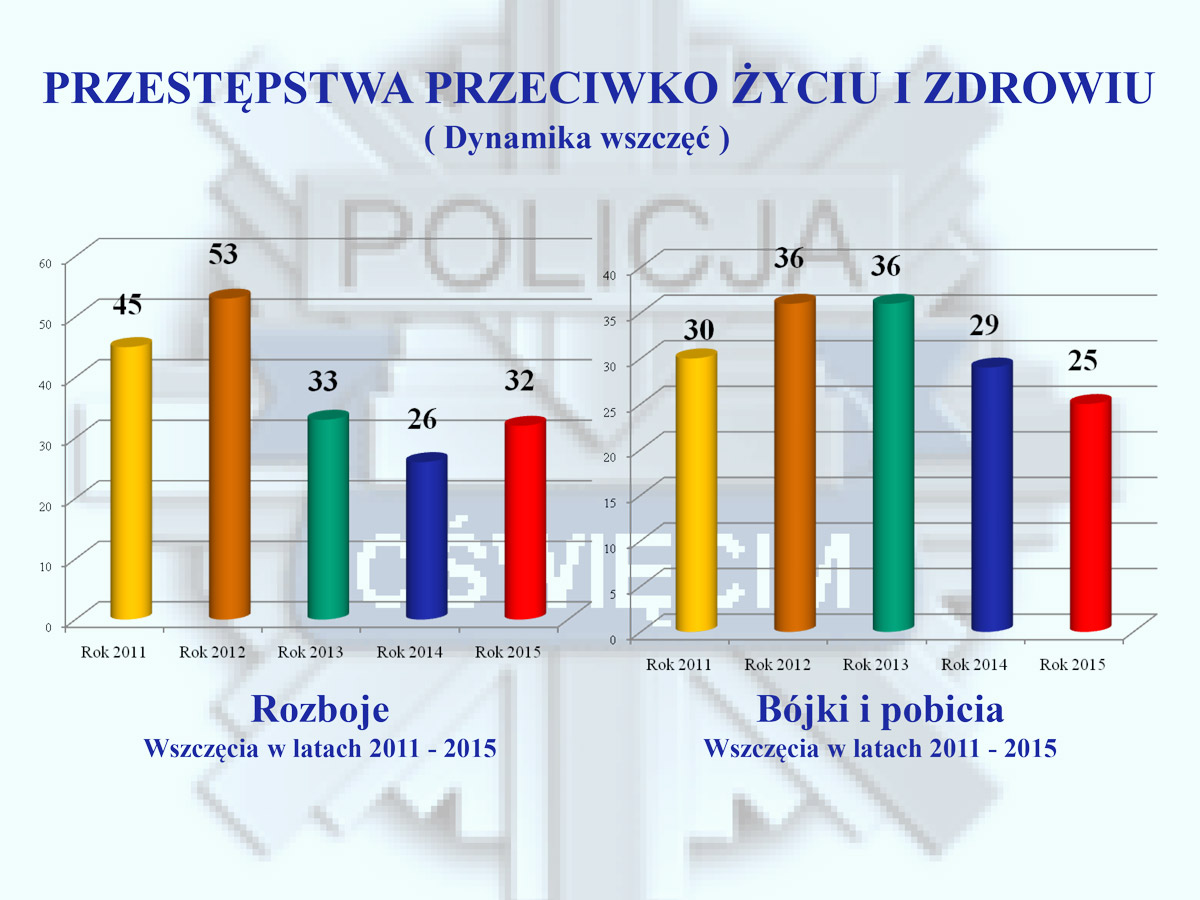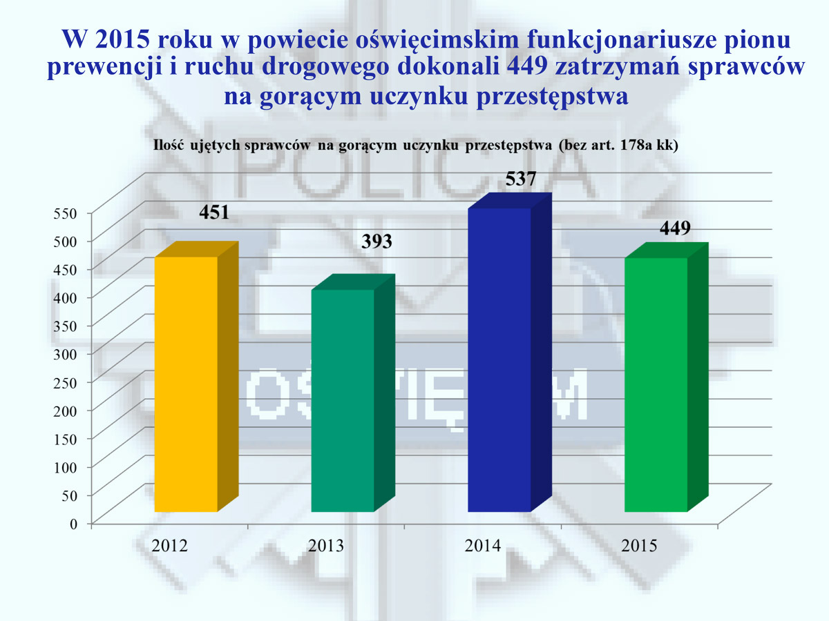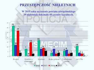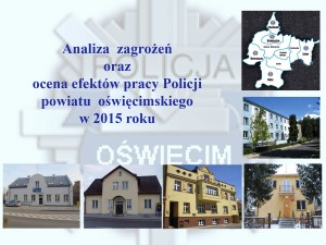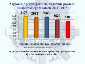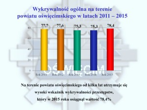 W minionym roku policjanci powiatu oświęcimskiego odnotowali spadek liczby czynów przestępczych z 2629 na 2383. Mniejszą liczbę czynów odnotowano przede wszystkim w kategoriach przestępstw najbardziej dokuczliwych społecznie m. in. włamaniach, kradzieżach, uszkodzeniach mienia oraz bójkach i pobiciach. W 2015 roku na terenie powiatu oświęcimskiego nie doszło do żadnego zabójstwa, natomiast rok wcześniej doszło do dwóch takich tragicznych zdarzeń. Warto podkreślić, że wzrosła ogólna wykrywalność sprawców przestępstw w 2015 roku. W ponad 78% wszczętych spraw, policjanci dzięki podjętym, skutecznym działaniom zatrzymali sprawców, a następnie doprowadzili ich przed wymiar sprawiedliwości.