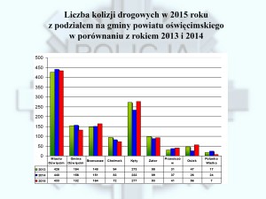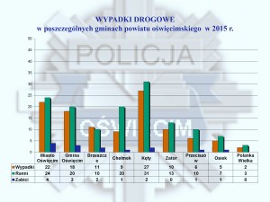 Analizując natomiast stan bezpieczeństwa w ruchu drogowym należy zauważyć, że znaczny wzrost liczby pojazdów na drogach w naszym powiecie przełożył się na blisko 3 procentowy wzrost liczby zdarzeń drogowych. Pomimo wielu akcji, działań kontrolnych i prewencyjnych przeprowadzonych na drogach powiatu oświęcimskiego w 2015 roku na drogach powiatu oświęcimskiego doszło do 110 wypadków drogowych, natomiast w 2014 było ich 107. W 2014 roku doszło do 1239 kolizji drogowych natomiast w 2015 odnotowano porównywalną ich liczbę. W wypadkach drogowych zginęło 14 osób, dokładnie tyle samo ofiar pochłonęły tragedie drogowe w 2014 roku. Liczba tych zdarzeń w dalszym ciągu jest niepokojąca, gdyż każdy przypadek to dramat dla wielu rodzin. Wśród ofiar wypadków drogowych znalazło się 8 pieszych, 2 kierowców, 3 pasażerów samochodów oraz 1 rowerzysta.