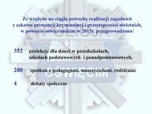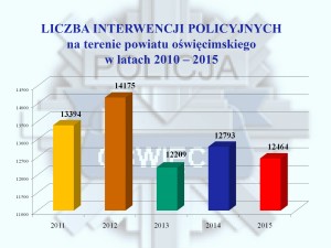 Podczas służby w 2015 roku policjanci ujawnili łącznie ponad 18 tysięcy wykroczeń, przeprowadzili 12,5 tysiąca różnego rodzaju interwencji, zatrzymali blisko 500 sprawców na gorącym uczynku przestępstwa, dbali bezpieczeństwo na terenie miast powiatu oświęcimskiego, podczas trwania 59 imprez masowych, przeprowadzili blisko 400 prelekcji w szkołach i przedszkolach, a także uczestniczyli w 280 spotkaniach z nauczycielami i rodzicami.