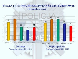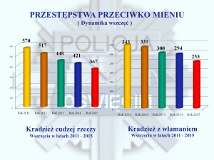 Podobnie jak w minionych latach, priorytetowym zadaniem dla służb policyjnych w 2015 roku było ograniczanie przestępczości oraz szybka, a za razem skuteczna reakcja na przestępstwa i wykroczenia przy wykorzystaniu wszystkich posiadanych sił i środków, a także stanowcze działanie wobec zachowań przestępczych i chuligańskich. Z przeprowadzonej analizy stanu bezpieczeństwa wynika, że założenia te zostały zrealizowane, dzięki bardzo dobrej pracy policjantów oraz pracowników cywilnych przy jednoczesnym wsparciu samorządów jak i samego społeczeństwa, które coraz częściej reaguje na przejawy łamania prawa.