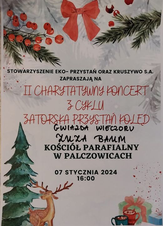 Stowarzyszenie Eko – Przystań i Kruszywo S.A zapraszają na II charytatywny koncert z cyklu: „Zatorska Przystań Kolęd” ze specjalnym występem Zuzy Baum, która wraz z akompaniamentem pianina będzie Gwiazdą Wieczoru.