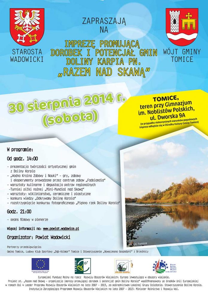 Serdecznie zapraszamy wszystkich Mieszkańców i Gości Powiatów Wadowickiego i Oświęcimskiego na imprezę pn. „Razem nad Skawą”, która odbędzie się 30 sierpnia 2014 r. (sobota) w Tomicach na terenie przy Gimnazjum im. Noblistów Polskich (ul. Dworska 9a). Organizatorem jest Powiat Wadowicki, a partnerami – Gmina Tomice, Ludowy Klub Sportowy „Dąb-Kolmar” Tomice oraz Stowarzyszenie „Nowoczesna Gospodyni” z Brzeźnicy.