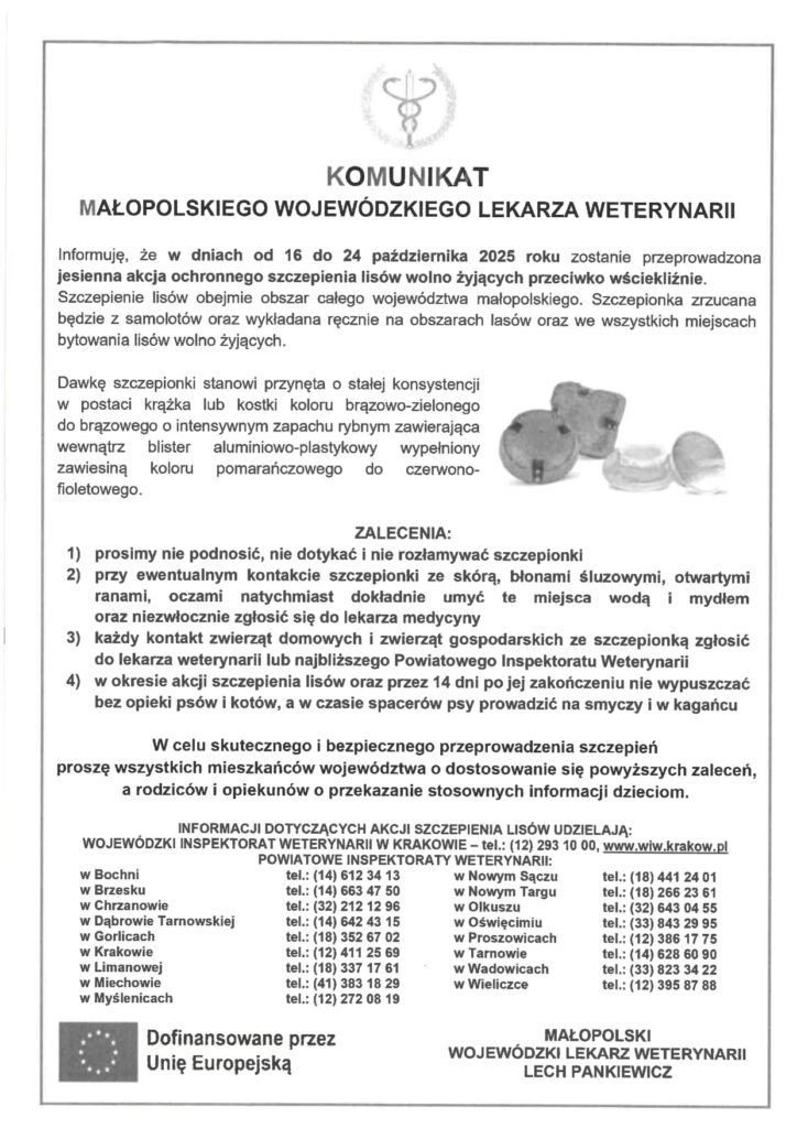 - REKLAMA - Strona głównaFakty i Wydarzenia Jesienna akcja ochronnego szczepienia lisów 7 października 2025 81 0 Musisz przeczytać #SMOLICE Jutrzejsze przerwy w dostawie prądu 26 stycznia 2026 Bilet za złotówkę dla uczniów z małopolski w czasie ferii 26 stycznia 2026 #RUDZE Jutrzejsze przerwy w dostawie prądu 28 stycznia 2026 Podlodowe zawody wędkarskie 27 stycznia 2026 - REKLAMA - W dniach od 16 do 24 października 2025 roku zostanie przeprowadzona jesienna akcja ochronnego szczepienia lisów wolno żyjących przeciwko wściekliźnie. Poprzedni artykułPlan polowań zbiorowych – Koło Łowieckie „KRUK” w ZatorzeNastępny artykułNowe boisko w Zatorze już otwarte - REKLAMA - Popularne #PODOLSZE Jutrzejsze przerwy w dostawie prądu 29 stycznia 2026 #RUDZE Jutrzejsze przerwy w dostawie prądu 28 stycznia 2026 Podlodowe zawody wędkarskie 27 stycznia 2026 ZOSTAW ODPOWIEDŹ Anuluj odpowiedź Komentarz: Proszę wpisać swój komentarz! Nazwa:* Proszę podać swoje imię tutaj E-mail:* Wpisałeś nieprawidłowy adres e-mail! Wpisz tutaj swój adres e-mail Strona Internetowa: Zapisz moje nazwisko, adres e-mail i stronę internetową w tej przeglądarce na następny raz, gdy skomentuję. Δ Zator zachmurzenie duże enter location -0.6 ° C -0 ° -0.6 ° 92 % 6.1kmh 100 % pt. -1 ° sob. -4 ° niedz. -7 ° pon. -8 ° wt. -2 ° - REKLAMA -