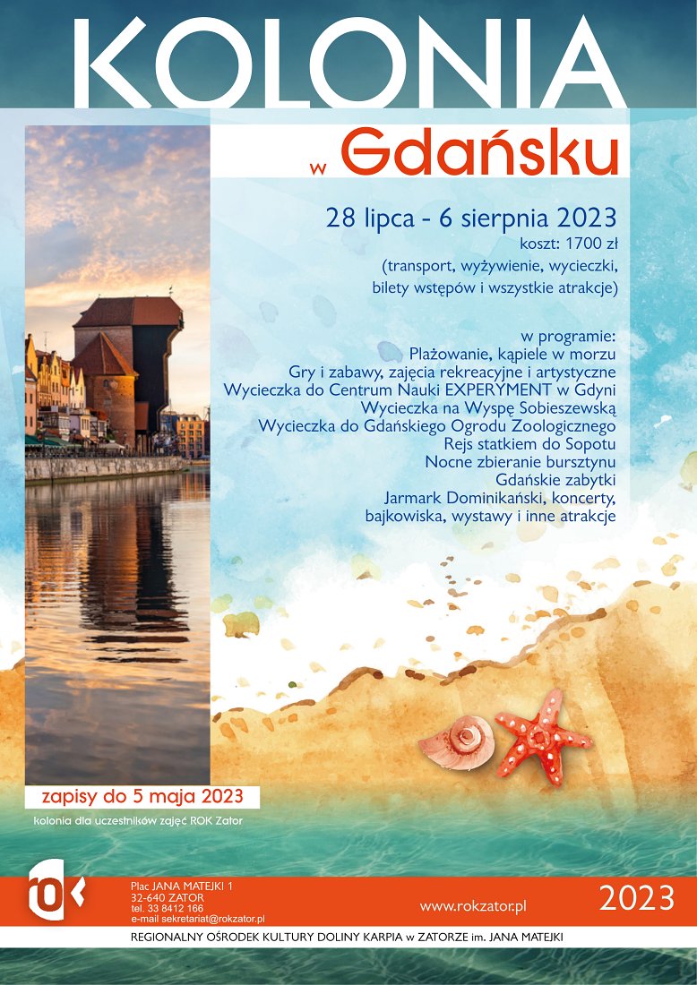 - REKLAMA - Strona głównaFakty i Wydarzenia Kolonia 2023. Zapisy do 5 maja! 21 kwietnia 2023 220 0 Musisz przeczytać #SMOLICE Jutrzejsze przerwy w dostawie prądu 26 stycznia 2026 Bilet za złotówkę dla uczniów z małopolski w czasie ferii 26 stycznia 2026 #RUDZE Jutrzejsze przerwy w dostawie prądu 28 stycznia 2026 Podlodowe zawody wędkarskie 27 stycznia 2026 - REKLAMA - Od 28 lipca do 6 sierpnia w Gdańsku! Jak co roku organizujemy kolonię letnią! Program kolonii jest jak zwykle bardzo bogaty! Koszt kolonii to 1700 zł. Na zapisy czekamy do 5 maja. Wszelkie informacje pod numerem telefonu 338412166. Info: ROK Zator Tagikolonia gdańskkolonia nad morzemrok zatorzapisy kolonia Poprzedni artykułSpławikowe zawody wędkarskie “Otwarcie Sezonu 2023”Następny artykułDługo wyczekiwana obniżka cen OKIEN - REKLAMA - Popularne #PODOLSZE Jutrzejsze przerwy w dostawie prądu 29 stycznia 2026 #RUDZE Jutrzejsze przerwy w dostawie prądu 28 stycznia 2026 Podlodowe zawody wędkarskie 27 stycznia 2026 ZOSTAW ODPOWIEDŹ Anuluj odpowiedź Komentarz: Proszę wpisać swój komentarz! Nazwa:* Proszę podać swoje imię tutaj E-mail:* Wpisałeś nieprawidłowy adres e-mail! Wpisz tutaj swój adres e-mail Strona Internetowa: Zapisz moje nazwisko, adres e-mail i stronę internetową w tej przeglądarce na następny raz, gdy skomentuję. Δ Zator zachmurzenie duże enter location -0.6 ° C -0 ° -0.6 ° 88 % 6kmh 100 % czw. 1 ° pt. 0 ° sob. -4 ° niedz. -6 ° pon. -7 ° - REKLAMA -