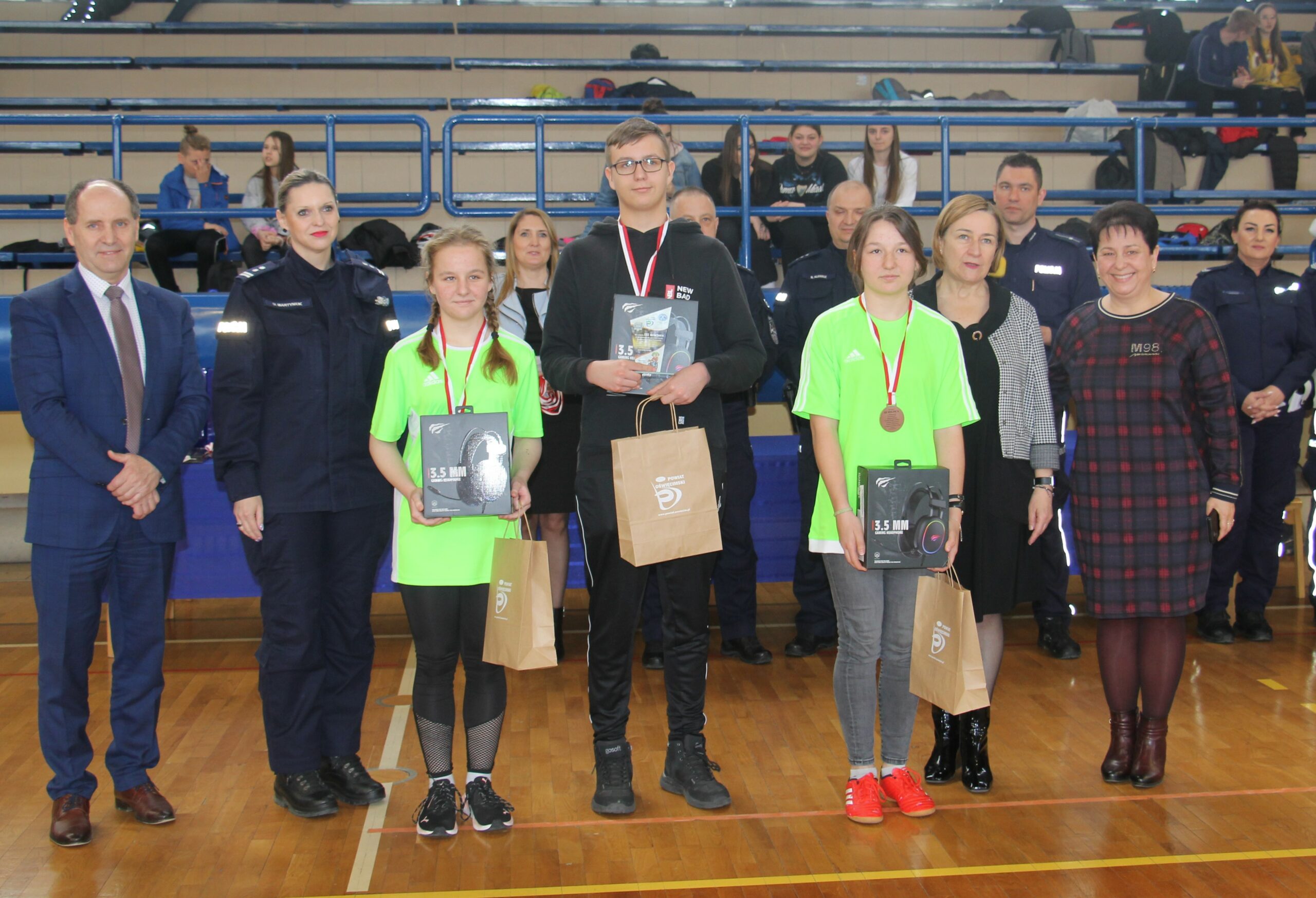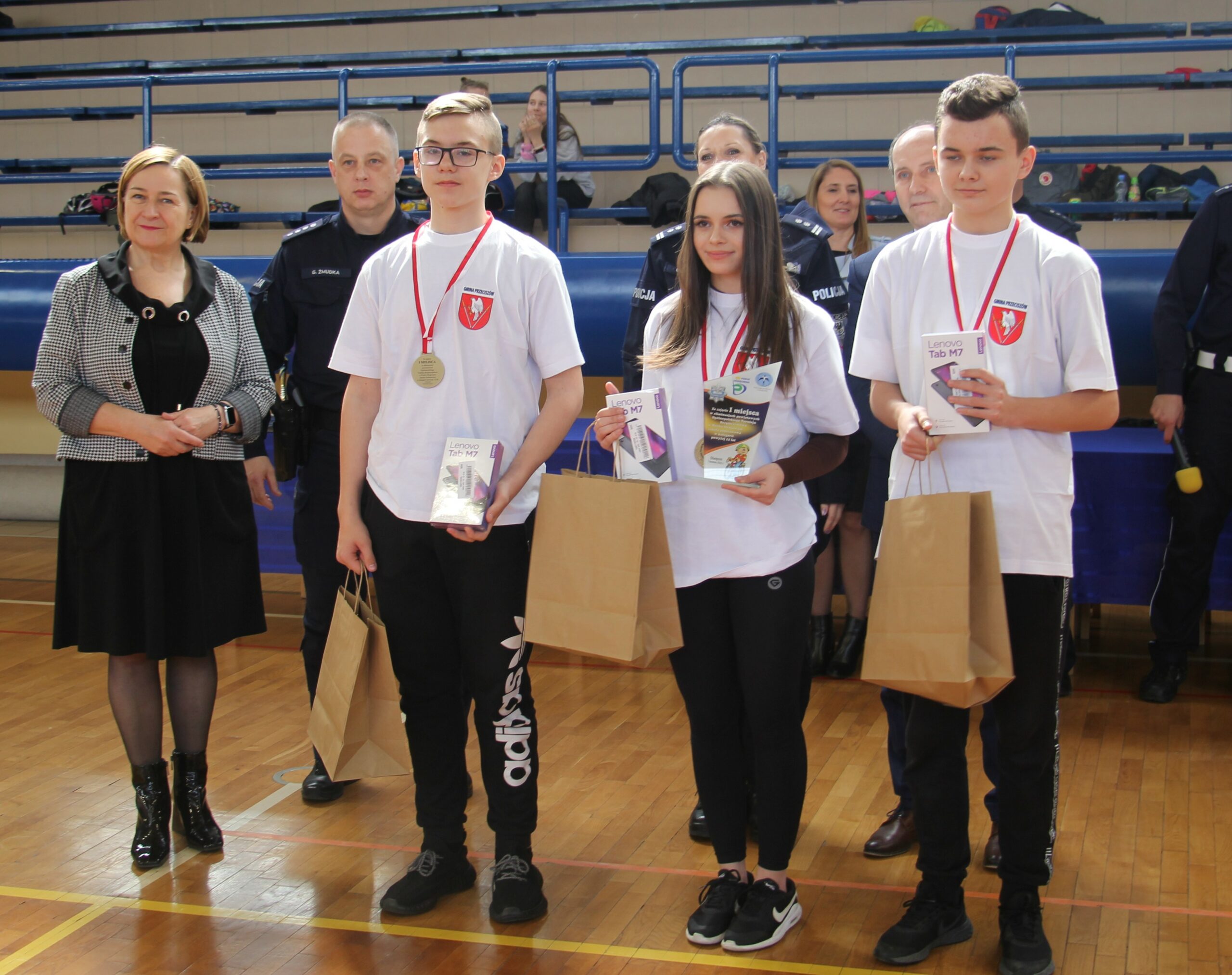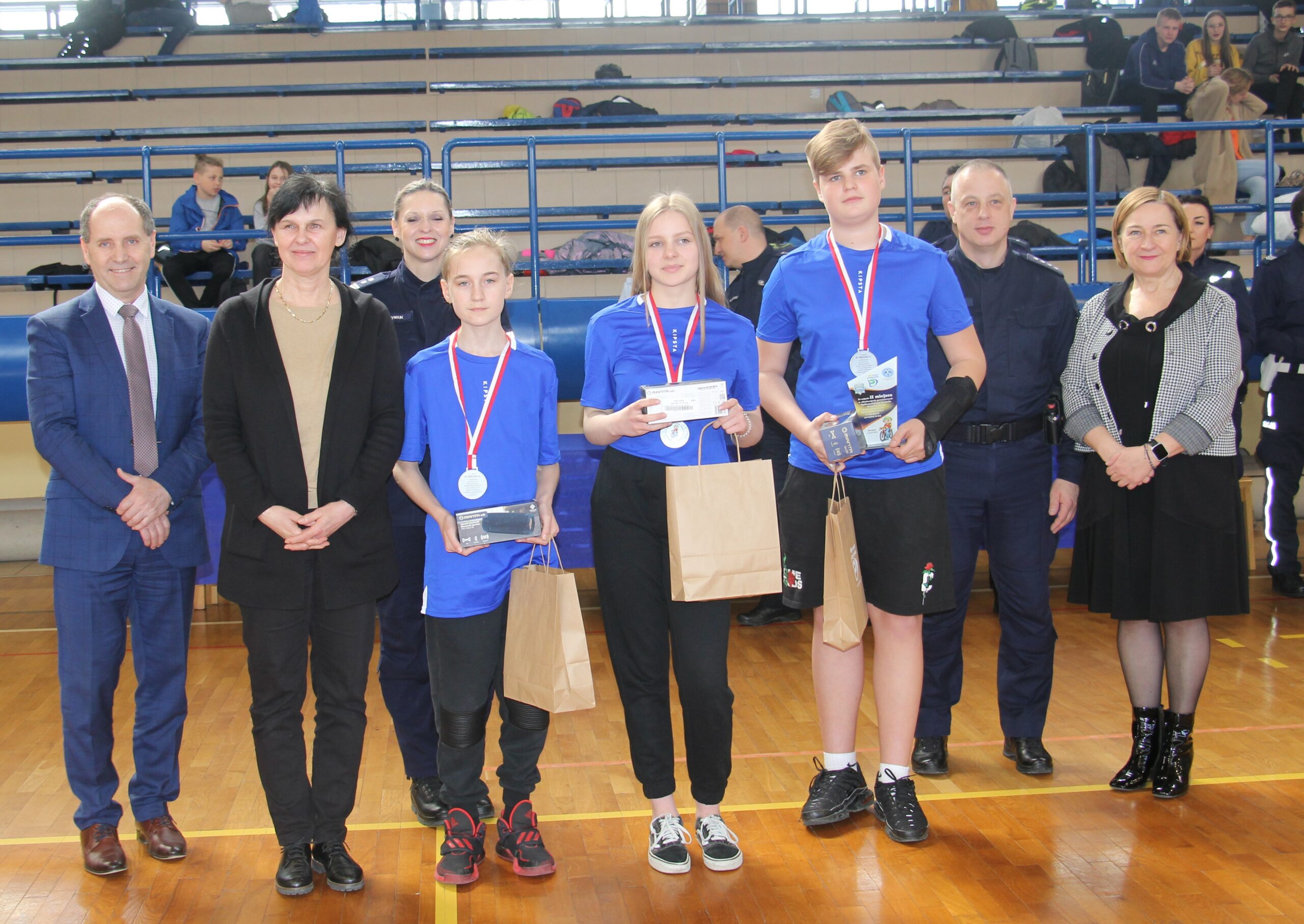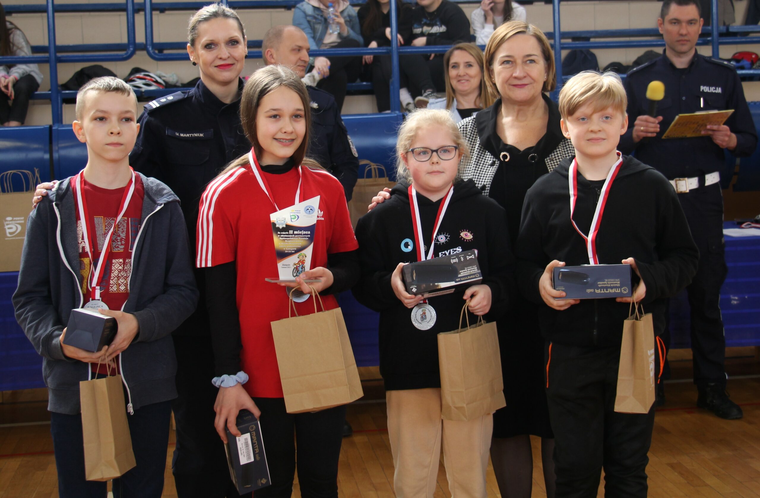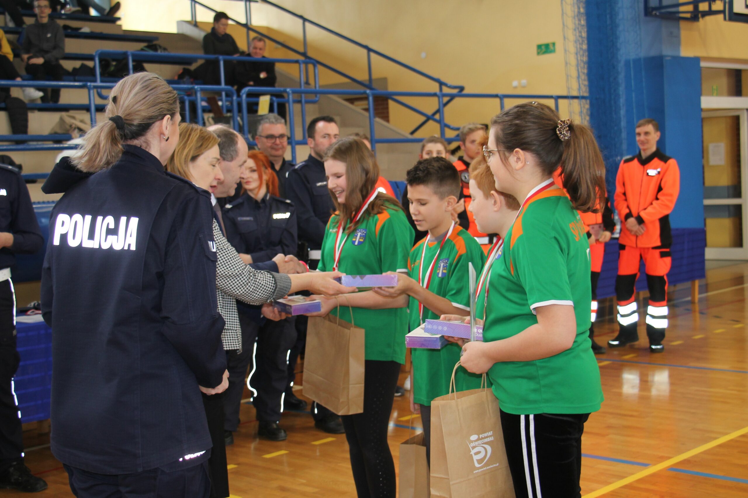 Nagrody wręczali: Pani Teresa Jankowska Członek Zarządu Powiatu w Oświęcimiu, Pan Mirosław Smolorek Wójt Gminy Oświęcim oraz przedstawiciele oświęcimskiej Policji podinsp. Urszula Martyniuk I Zastępca Komendanta Powiatowego Policji w Oświęcimiu, nadkom. Grzegorz Żmudka Naczelnik Wydziału Ruchu Drogowego oraz nadkom. Bartłomiej Kleszcz Zastępca Naczelnika Wydziału Ruchu Drogowego.