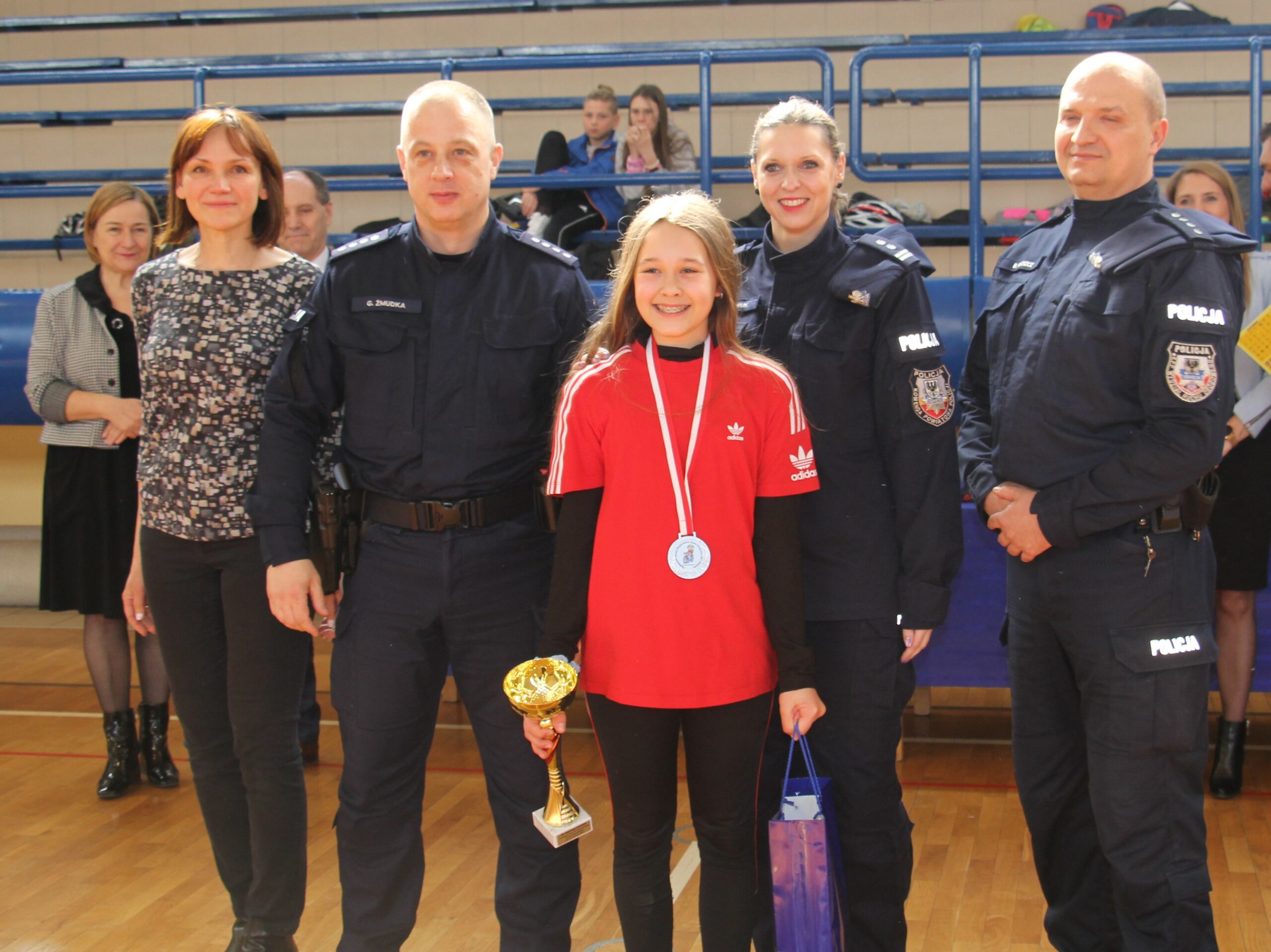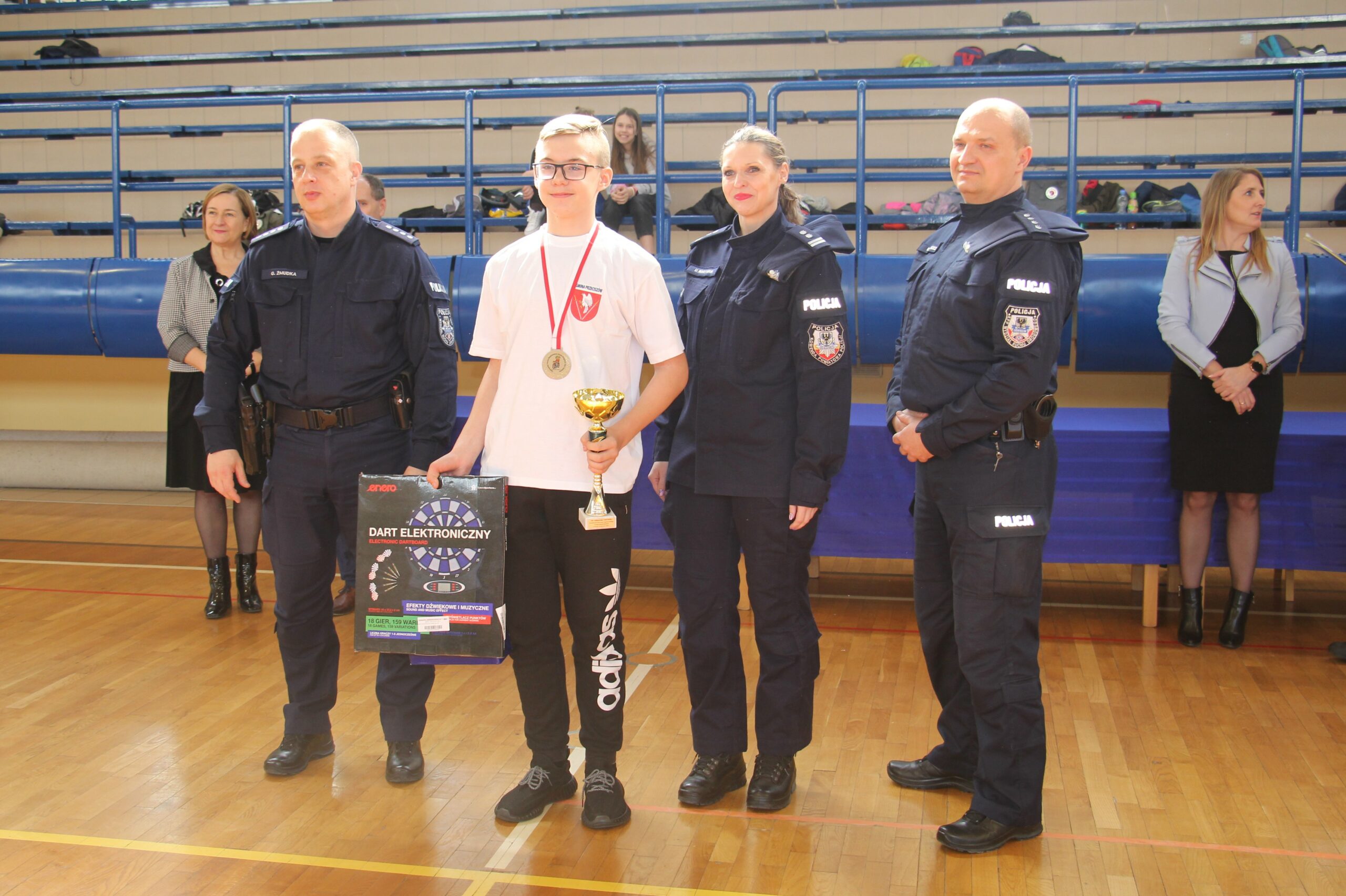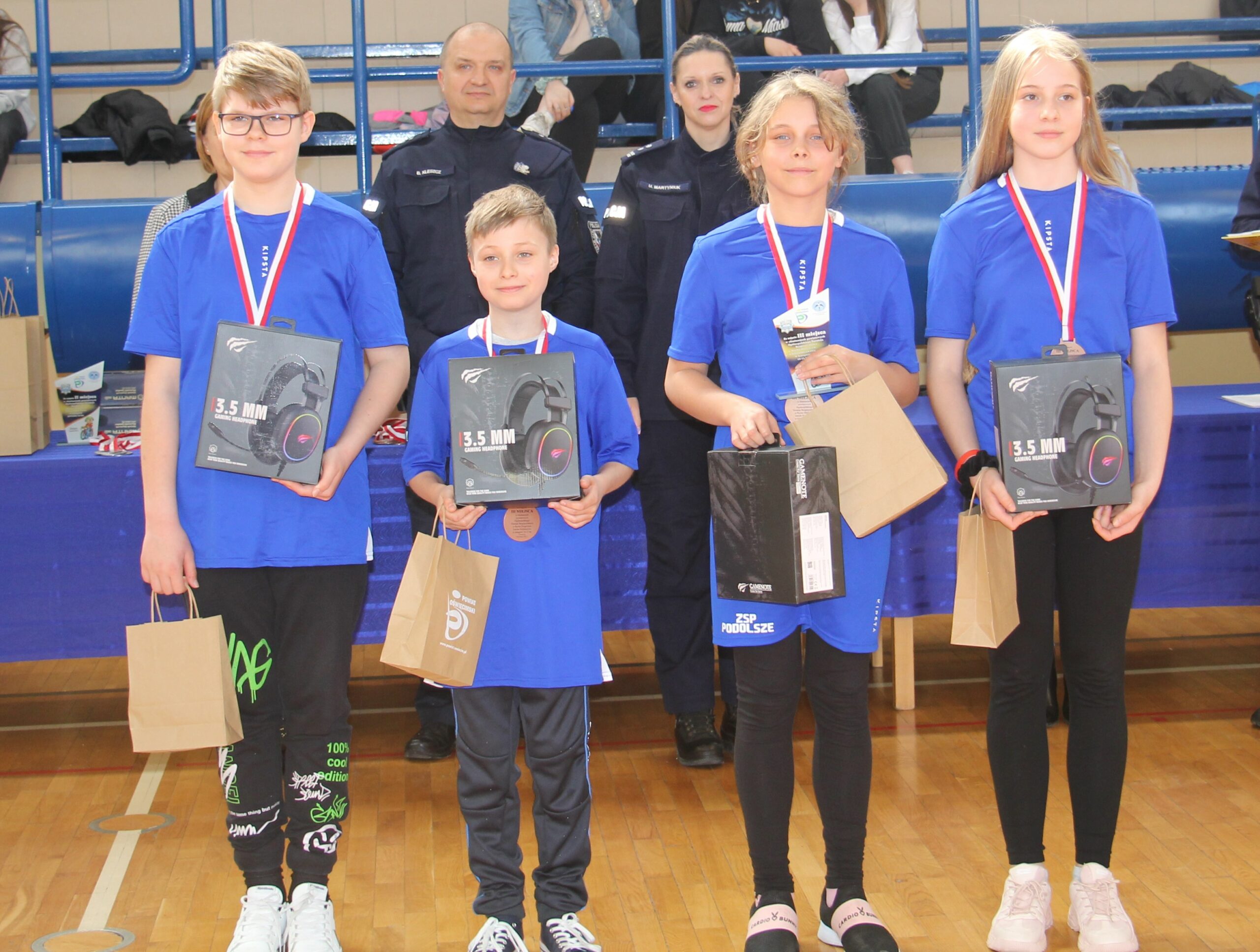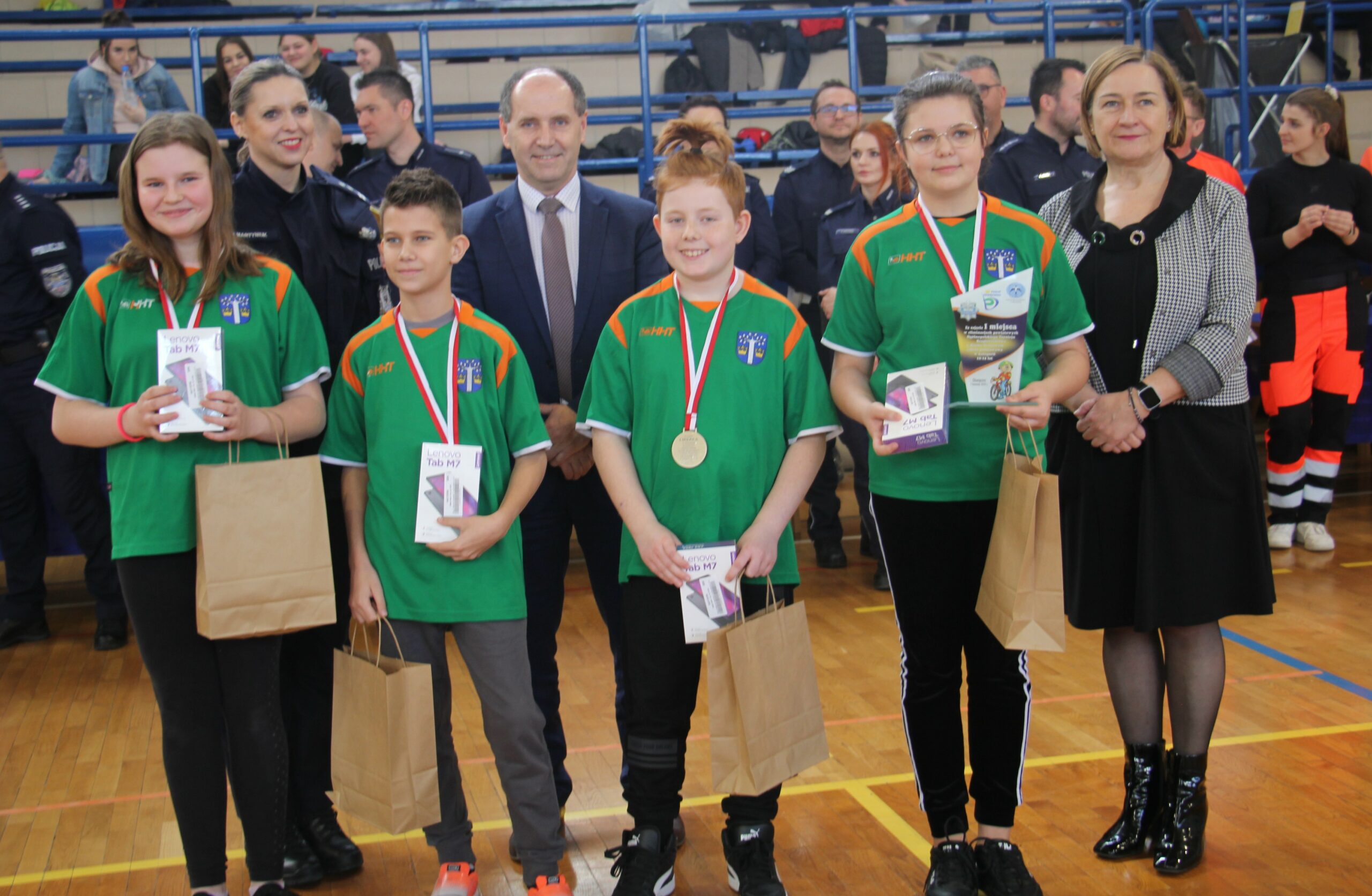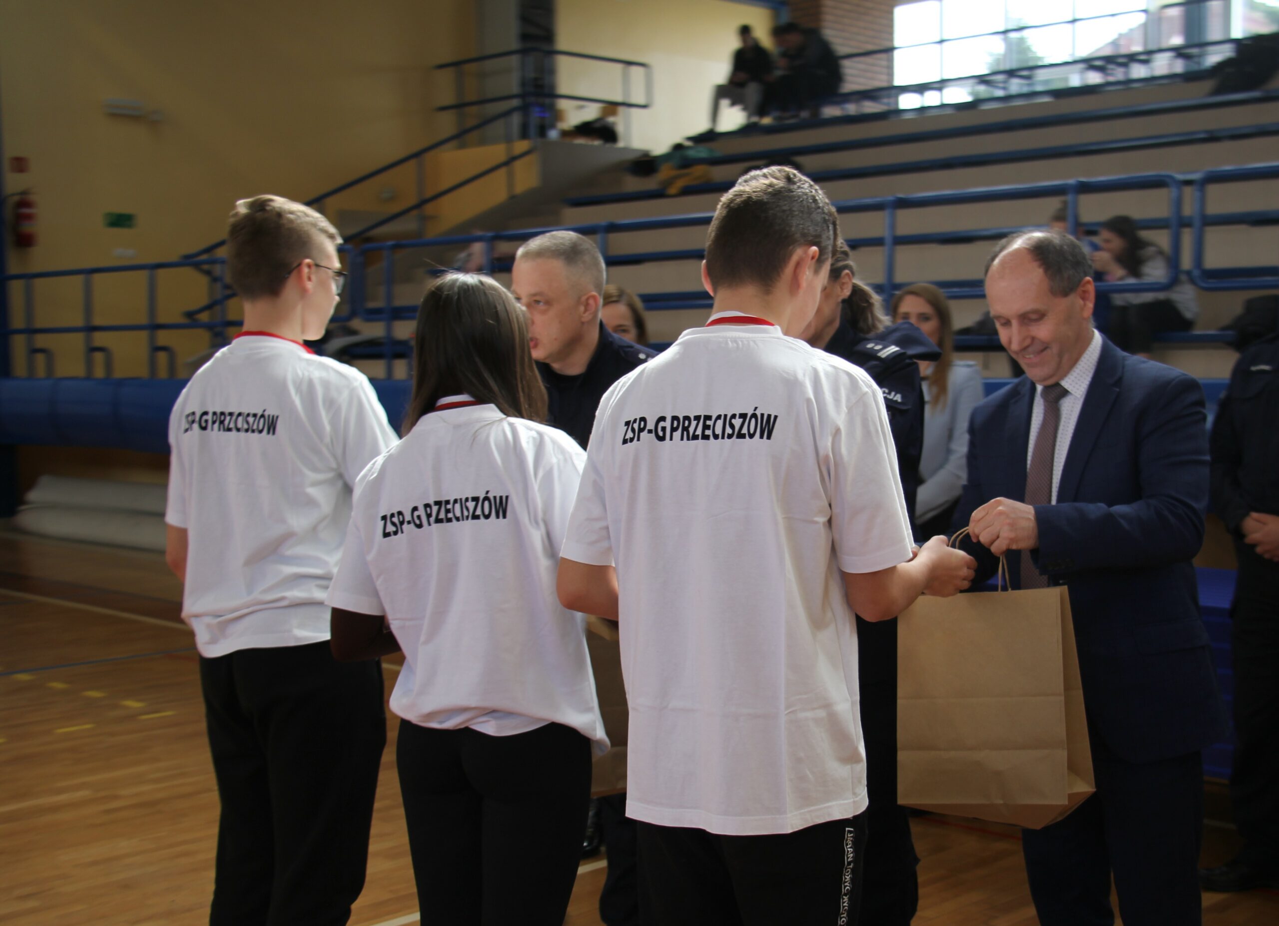 Nagrody wręczali: Pani Teresa Jankowska Członek Zarządu Powiatu w Oświęcimiu, Pan Mirosław Smolorek Wójt Gminy Oświęcim oraz przedstawiciele oświęcimskiej Policji podinsp. Urszula Martyniuk I Zastępca Komendanta Powiatowego Policji w Oświęcimiu, nadkom. Grzegorz Żmudka Naczelnik Wydziału Ruchu Drogowego oraz nadkom. Bartłomiej Kleszcz Zastępca Naczelnika Wydziału Ruchu Drogowego.