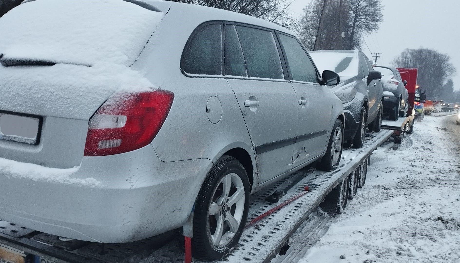 W trakcie czynności na miejscu zdarzenia policjanci ustalili, że kierowca lawety wiozącej samochody, na łuku drogi stracił panowanie nad pojazdem, a następnie zjechał na przeciwległy pas jezdni, gdzie zderzył się z samochodem marki Audi, a następnie uderzył w drewniany słup. W wyniku zdarzenia kobieta kierująca audi oraz kierowca lawety nie doznali obrażeń ciała. Na sprawcę kolizji policjanci nałożyli mandat i punkty karne.