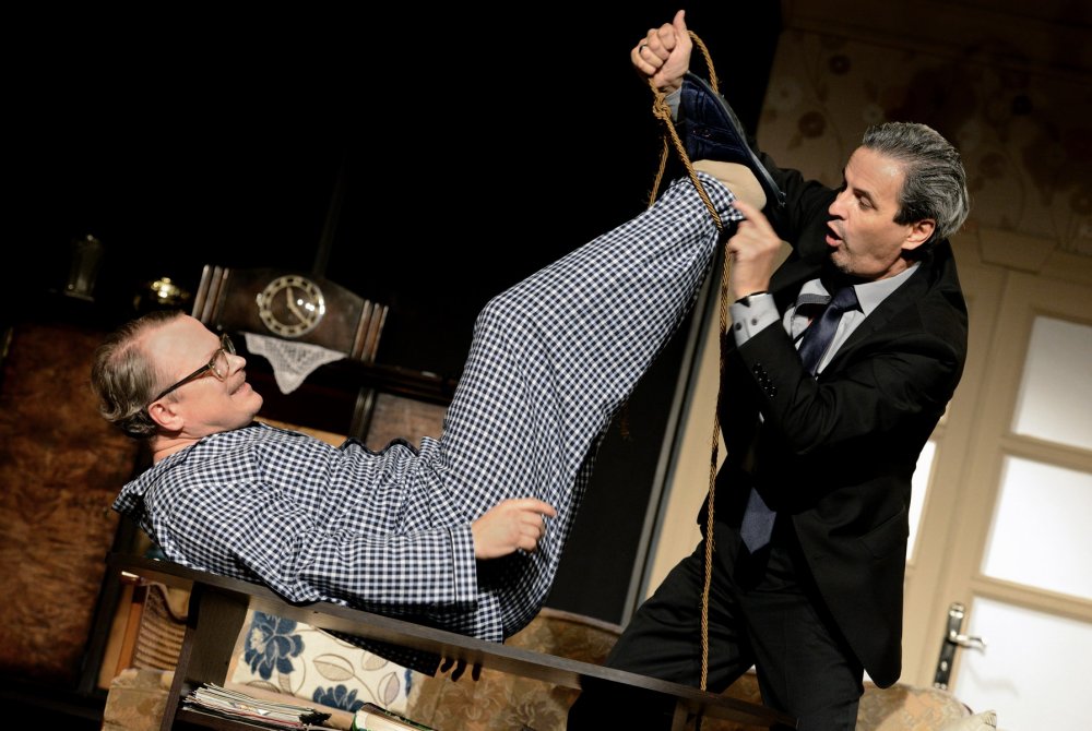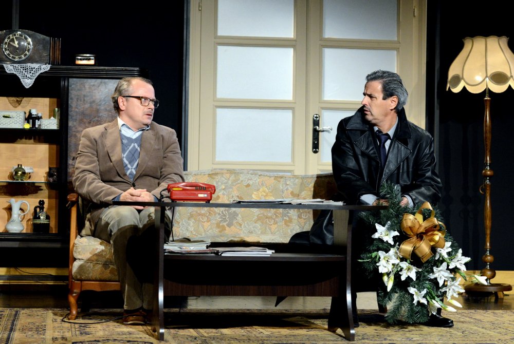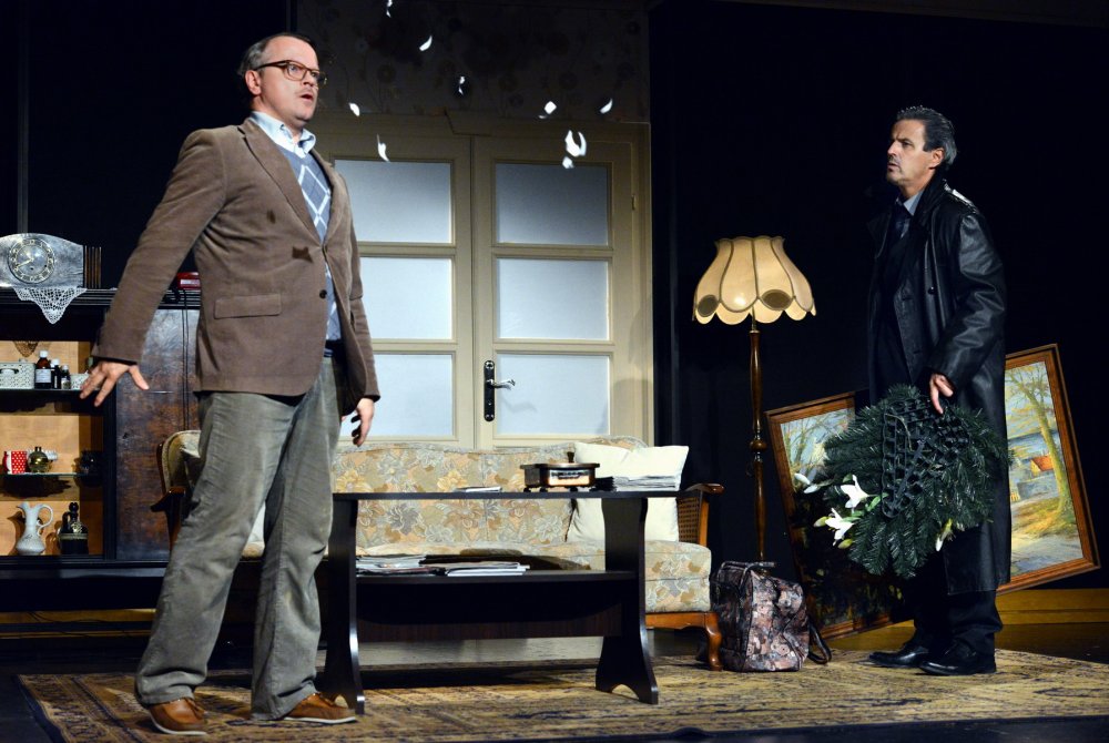 „Pół na pół” to przesycona czarnym humorem komedia, opowiadająca o dwóch przyrodnich braciach, którzy postanawiają pozbyć się swojej rodzicielki. Czy można polubić kogoś, kto źle życzy własnej matce? Okazuje się, że i owszem. Robert i Dominik, którzy na początku jawią nam się jako dwa niezbyt sympatyczne typy (jeden chce uciec, bo ma dość opiekowania się na wpół sparaliżowaną staruszką, drugiemu najbardziej zależy na pieniądzach ze spadku), powoli odkrywają coraz mroczniejsze tajemnice, które pokazują, jakim potworem była i jest ich własna matka. Nestorka rodu nie pojawia się na scenie, jej obecność sygnalizuje tylko natarczywy dzwonek, a mimo to mamy świadomość, że nadal jest wszechobecna i wciąż tyranizuje otoczenie, a na dodatek jest „niezatapialna” jak nie przymierzając pani Wilberforce z „Trzeba zabić starszą panią”…