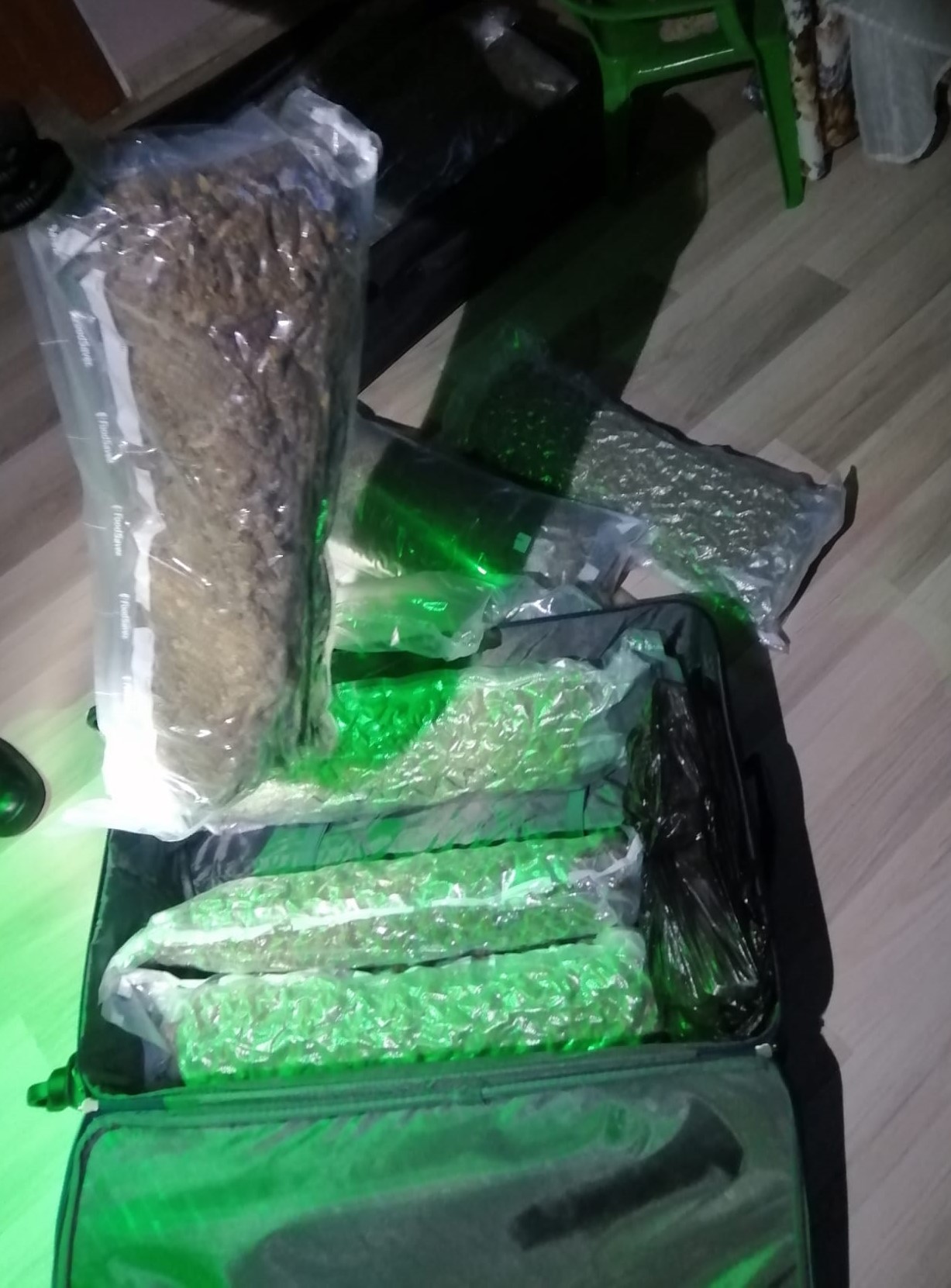 Podczas przeszukania posesji funkcjonariusze znaleźli w jednym z pomieszczeń użytkowych budynku dwie walizki turystyczne, w których znajdował się zapakowany hermetycznie susz roślinny, który po sprawdzeniu testerem narkotycznym okazał się być suszem konopi innych niż włókniste.