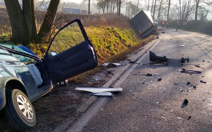 Obydwa pojazdy zostały znacznie uszkodzone. Aby wyciągnąć naczepę, która znalazła się w rowie wezwano ciężki sprzęt.