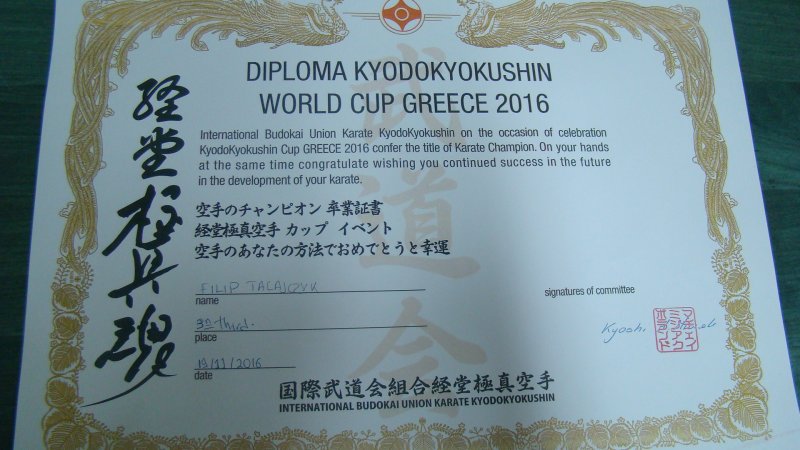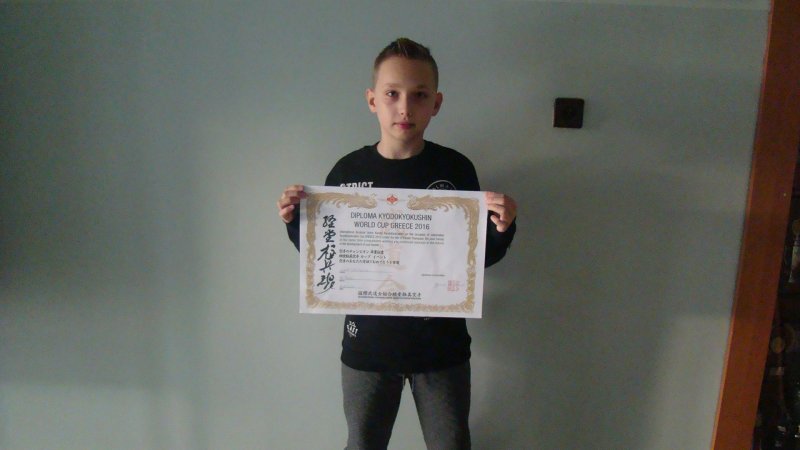 Filip Tałajczyk, uczeń klasy piatej Szkoły Podstawowej im. Adama Mickiewicza w Zatorze, dnia 19.11.2016 r. wziął udział w Pucharze Świata Karate KYOKUSHIN Grecja Klkis 2016, zajmując zaszczytne trzecie miejsce na podium. Filip od lat trenuje w Klubie Karate KYOKUSHINKAI pod okiem Pana Tomasza Rajdy. Serdecznie gratulujemy sukcesu i życzymy dalszych.