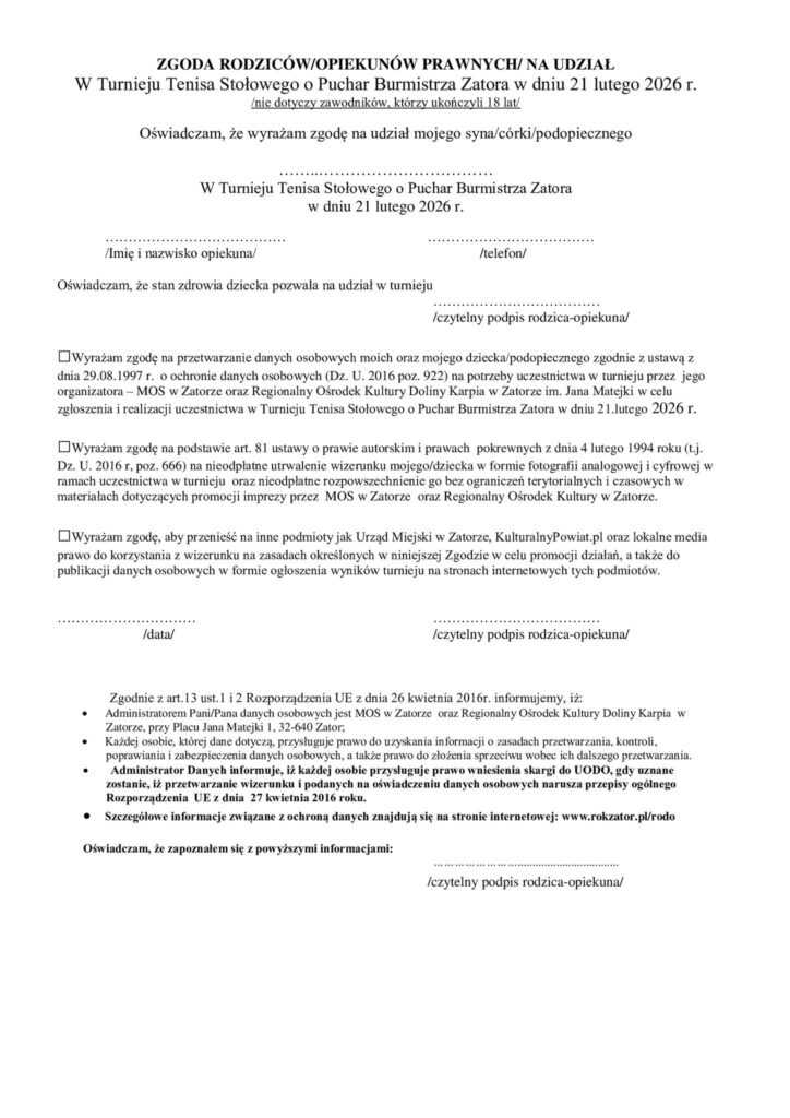 Prosimy o jej wydrukowanie, podpisanie i dostarczenie do biura zawodów w dniu turnieju.