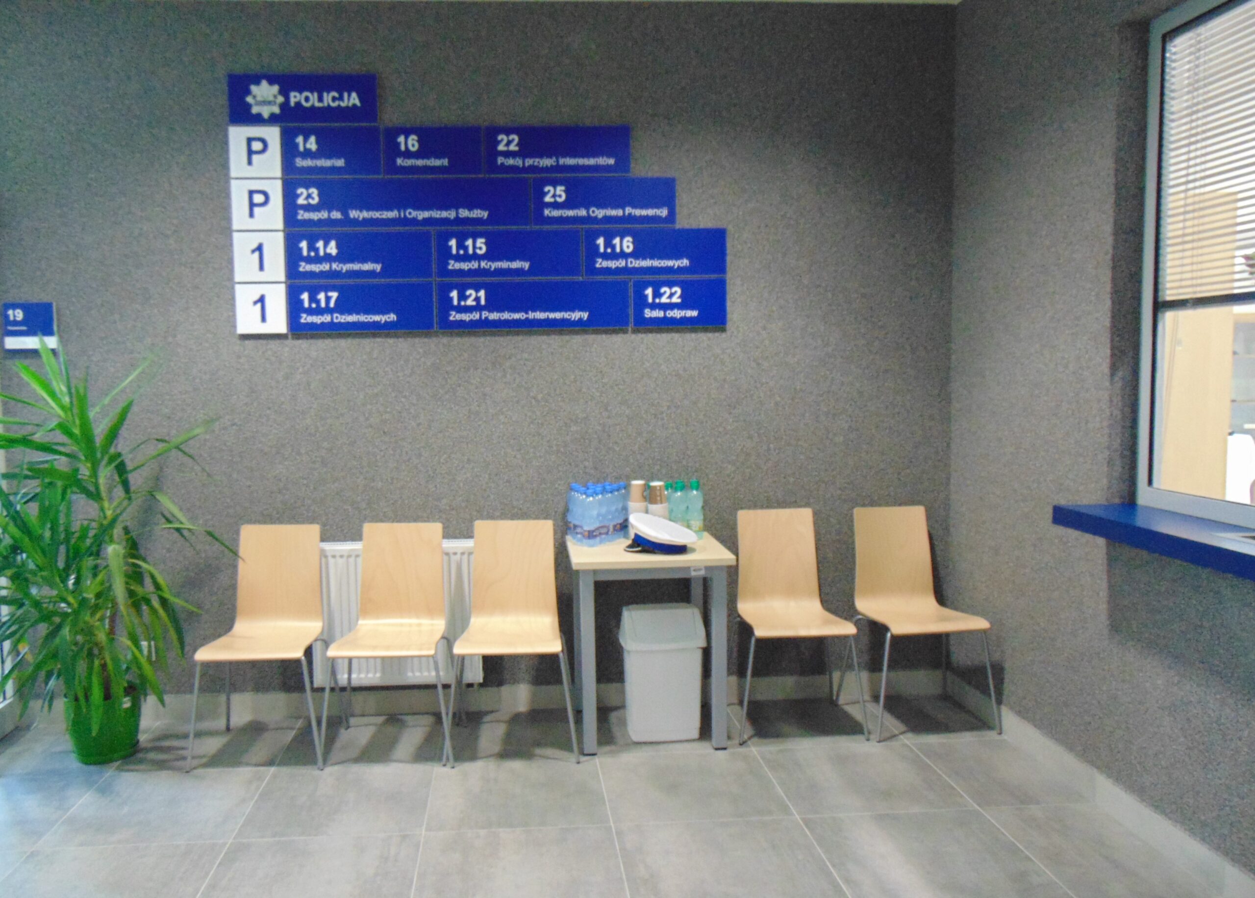Na poziomie parteru znajduje się: poczekalnia z sanitariatami dla osób niepełnosprawnych, pokój przyjęć interesantów, pomieszczenie komendanta z węzłem sanitarnym, sekretariat z kancelarią tajną, pomieszczenie socjalne, składnica akt, magazyn dowodów rzeczowych pomieszczenie magazynowe, hol z korytarzami, sanitariaty damski i męski, pomieszczenie gospodarcze, biuro kierownika Ogniwa Prewencji, biuro Zespołu ds. Wykroczeń i Organizacji Służby.