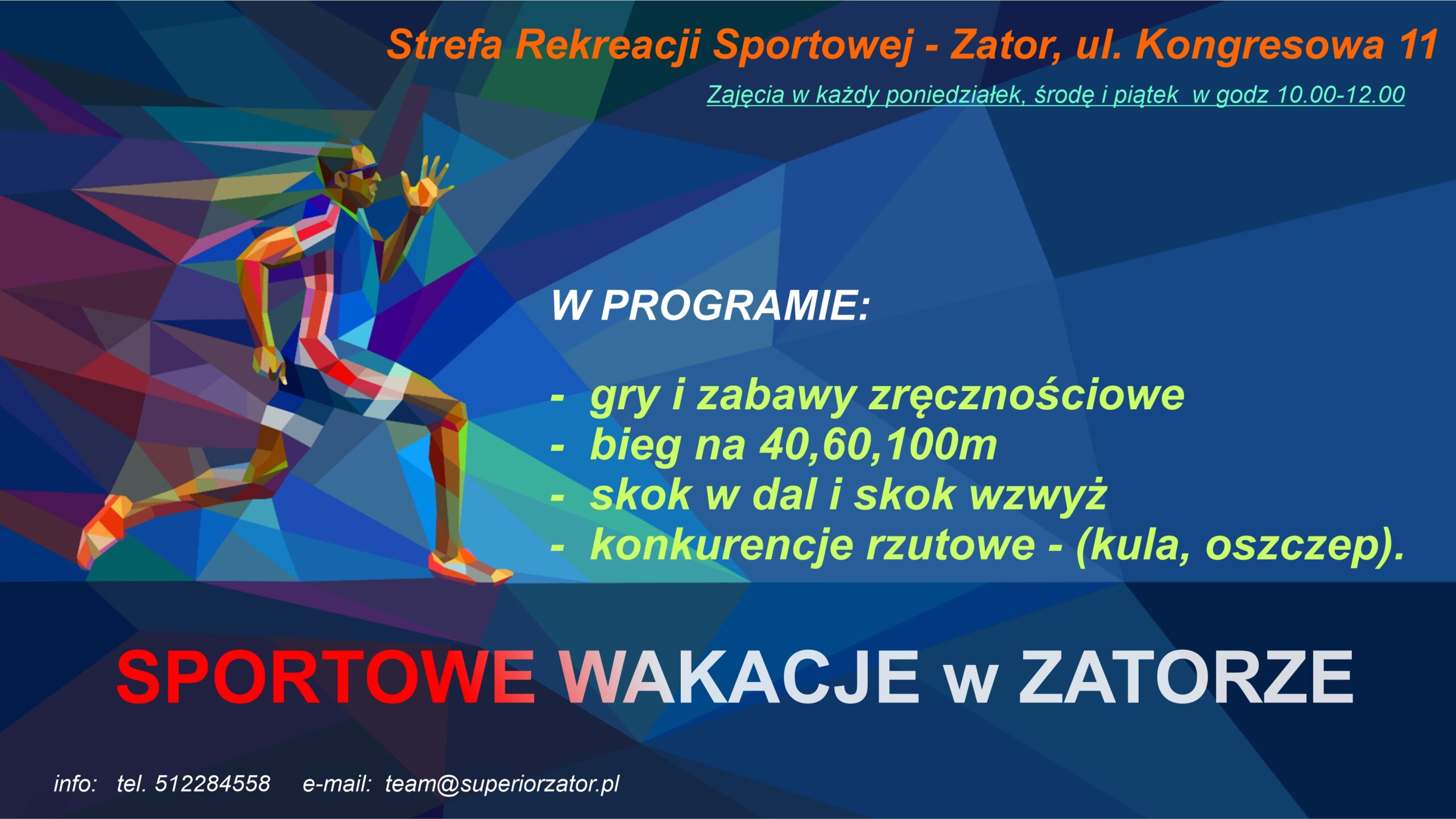 Zapraszamy na obiekty Strefy Rekreacji Sportowej w Zatorze. W przypadku złej pogody zajęcia odbywać się będą w hali sportowej ZSO Zator.