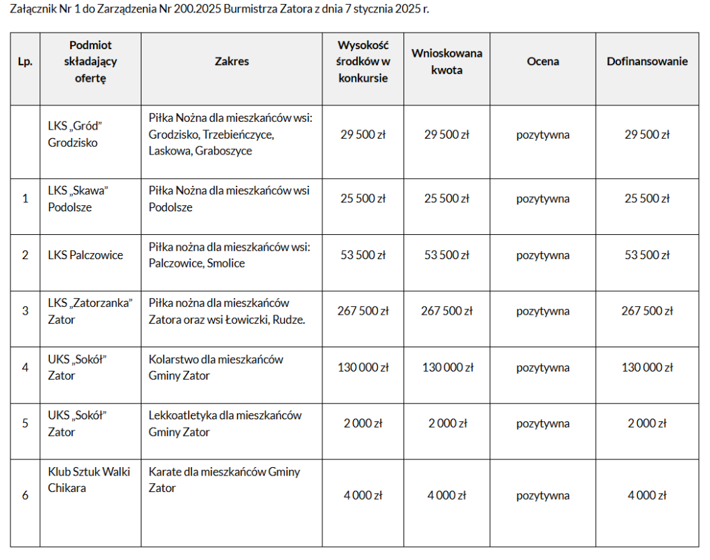- REKLAMA - Strona głównaFakty i Wydarzenia Wsparcie sportu na terenie Gminy Zator w 2025 8 stycznia 2025 192 0 Musisz przeczytać #SMOLICE Jutrzejsze przerwy w dostawie prądu 26 stycznia 2026 Bilet za złotówkę dla uczniów z małopolski w czasie ferii 26 stycznia 2026 #RUDZE Jutrzejsze przerwy w dostawie prądu 28 stycznia 2026 Podlodowe zawody wędkarskie 27 stycznia 2026 - REKLAMA - Wyniki konkursu ofert na realizację zadania publicznego w ramach wsparcia sportu na terenie Gminy Zator w 2025 roku. Info: UM Zator Poprzedni artykułZmiany w LKS ZatorzankaNastępny artykułRadni jednogłośnie przyjęli budżet Gminy Zator na bieżący rok - REKLAMA - Popularne #PODOLSZE Jutrzejsze przerwy w dostawie prądu 29 stycznia 2026 #RUDZE Jutrzejsze przerwy w dostawie prądu 28 stycznia 2026 Podlodowe zawody wędkarskie 27 stycznia 2026 ZOSTAW ODPOWIEDŹ Anuluj odpowiedź Komentarz: Proszę wpisać swój komentarz! Nazwa:* Proszę podać swoje imię tutaj E-mail:* Wpisałeś nieprawidłowy adres e-mail! Wpisz tutaj swój adres e-mail Strona Internetowa: Zapisz moje nazwisko, adres e-mail i stronę internetową w tej przeglądarce na następny raz, gdy skomentuję. Δ Zator zachmurzenie duże enter location -0.6 ° C -0.6 ° -1 ° 93 % 5.5kmh 100 % pt. 2 ° sob. -4 ° niedz. -6 ° pon. -7 ° wt. -4 ° - REKLAMA -
