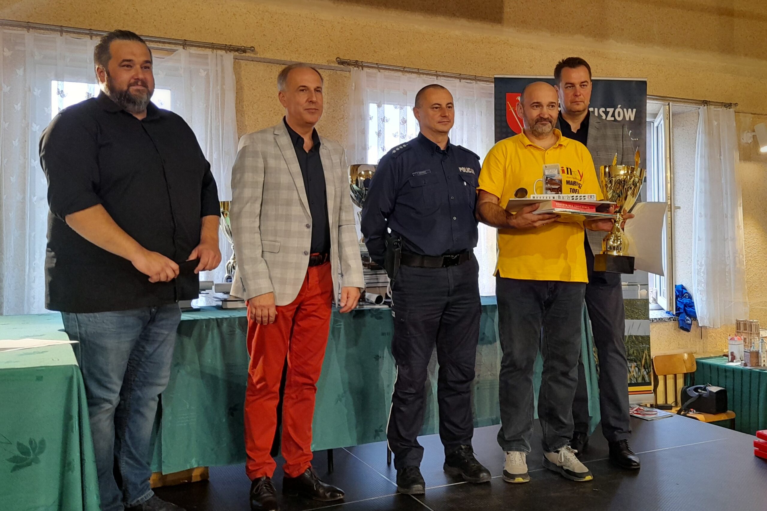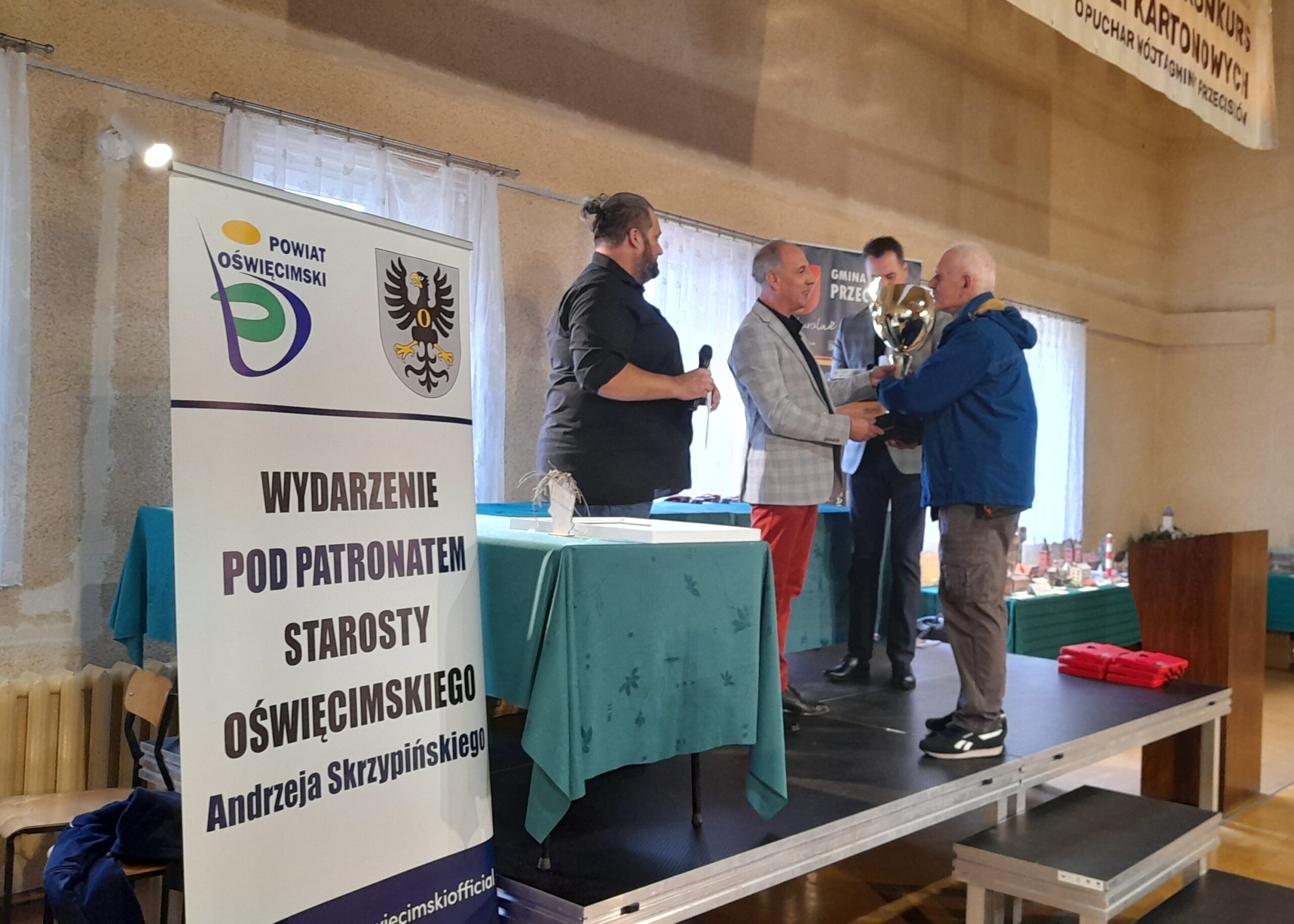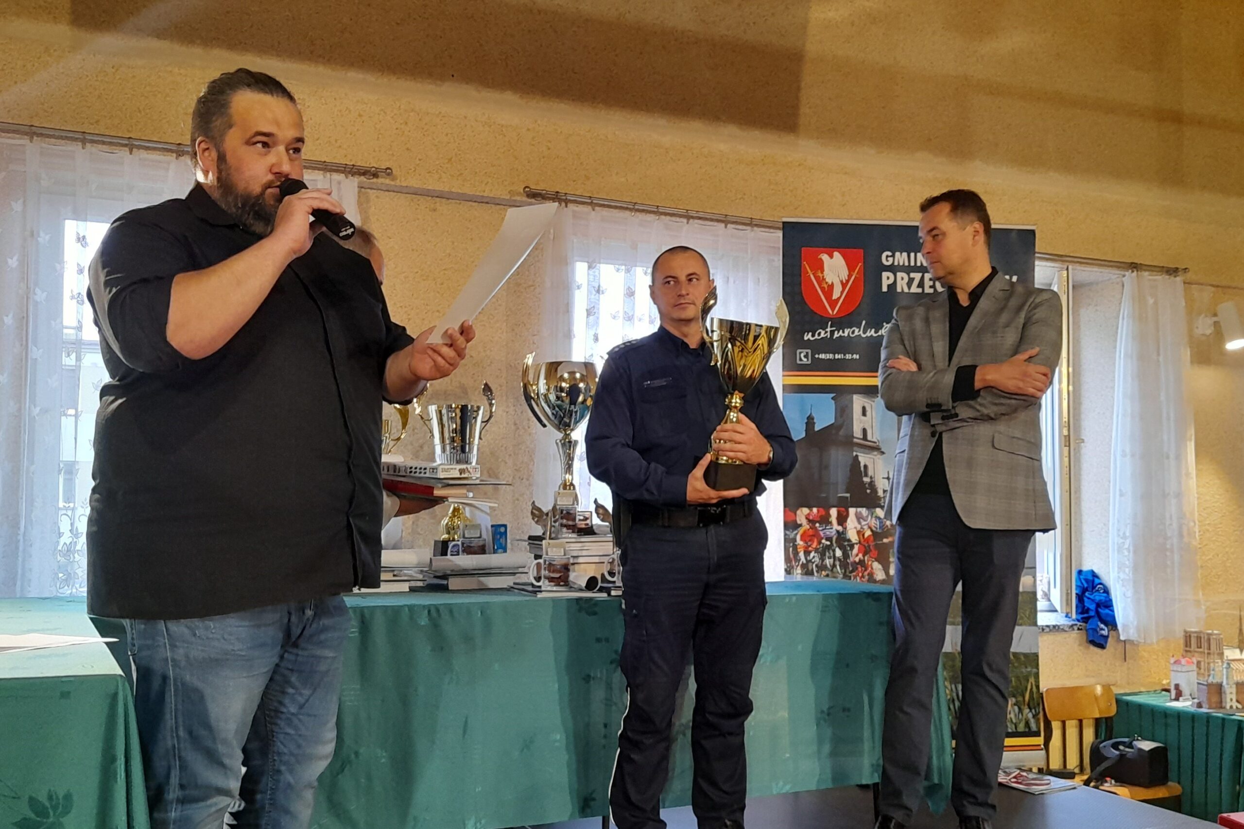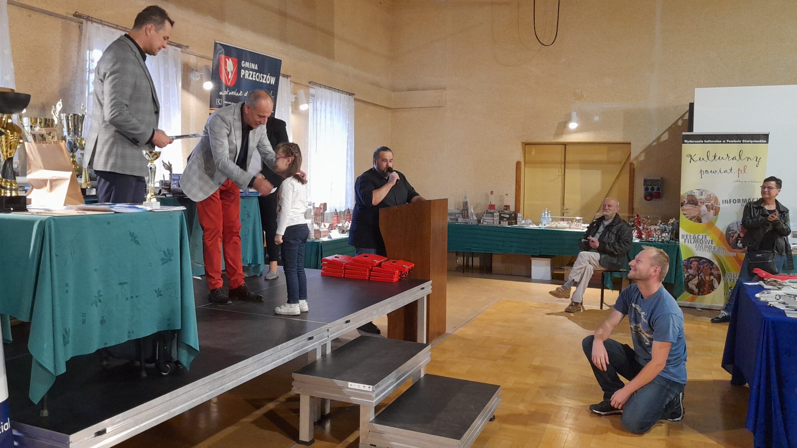 Przybyłych na galę finałową gości, powitał Kierownik Gminnej Biblioteki Publicznej pan Łukasz Fuczek, który dwadzieścia jeden lat temu zainicjował ten wyjątkowy konkurs. Modelarze walczyli o puchary, medale i nagrody w kilkudziesięciu różnych kategoriach. Do zdobycia były między innymi puchary: Wójta Gminy Przeciszów, Starosty Oświęcimskiego, Publiczności oraz Komendanta Powiatowego Policji w Oświęcimiu. Ten ostatni – za najlepszy model pojazdu bojowego w kategorii junior, zdobył Adam Górka za model czołgu CHI – RI. Laureat odebrał puchar, medal oraz nagrodę z rąk Naczelnika Wydziału Prewencji asp. szt. Tomasza Gródka. Na zakończenie uroczystości Kierownik Biblioteki, Wójt Gminy Przeciszów, Starosta Oświęcimski oraz Naczelnik pogratulowali wszystkim uczestnikom, a następnie zaprosili ich do wzięcia udziału w przyszłorocznym turnieju.