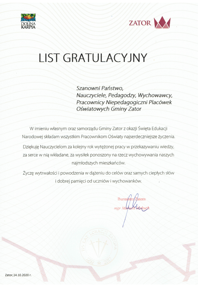 W imieniu własnym oraz samorządu Gminy Zator z okazji Święta Edukacji Narodowej składam wszystkim Pracownikom Oświaty najserdeczniejsze życzenia.