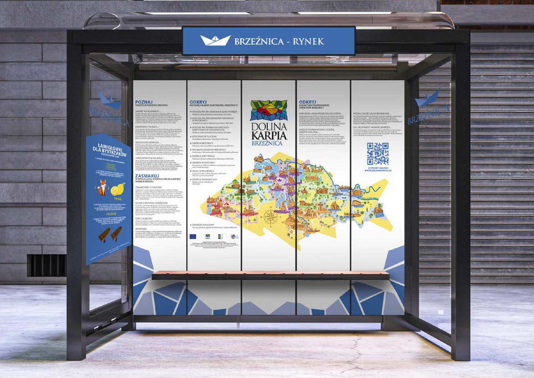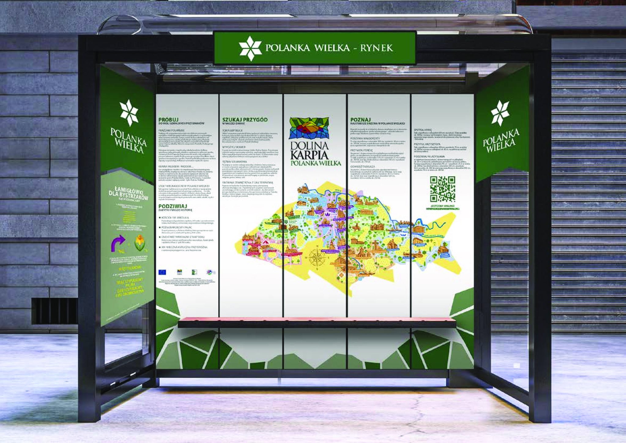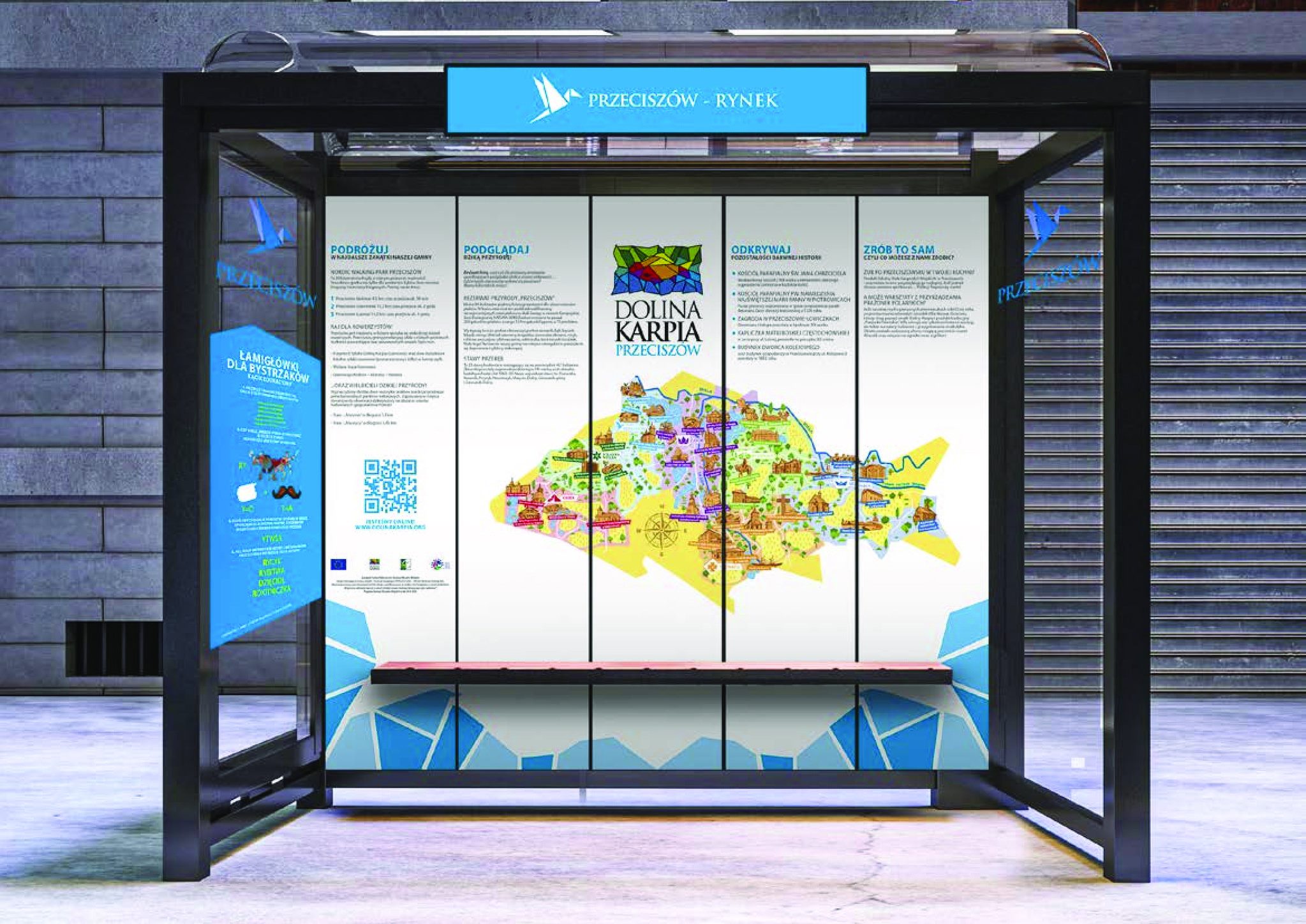 Na każdym przystanku znajdzie się kolorowa mapa Doliny Karpia z zaznaczonymi najważniejszymi obiektami turystycznymi, teksty dotyczące zabytków, przyrody, tradycji naszego regionu a także lokalnych atrakcji oraz łamigłówki dla dzieci. Wszystko zgodnie z Systemem Identyfikacji Wizualnej Doliny Karpia.