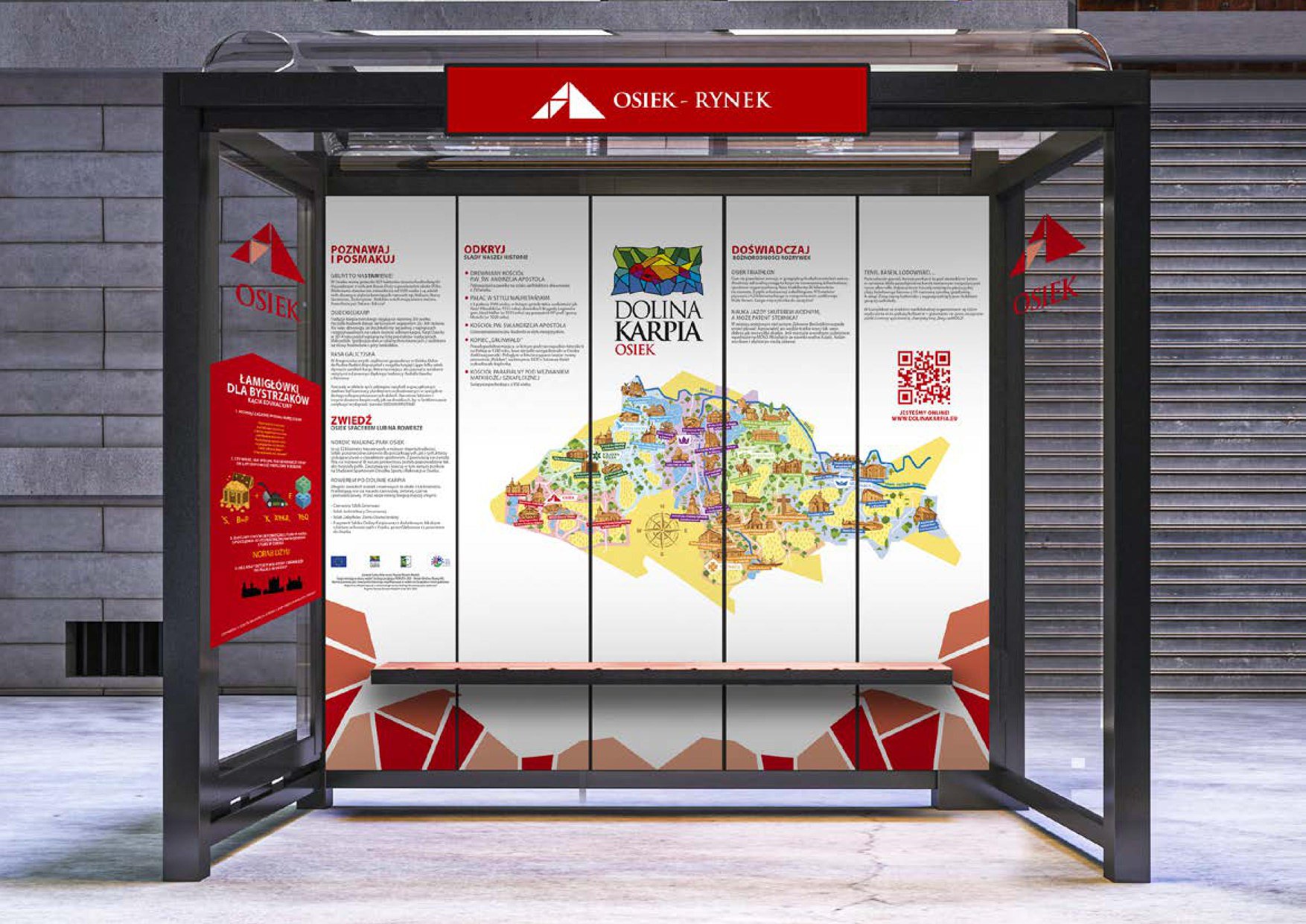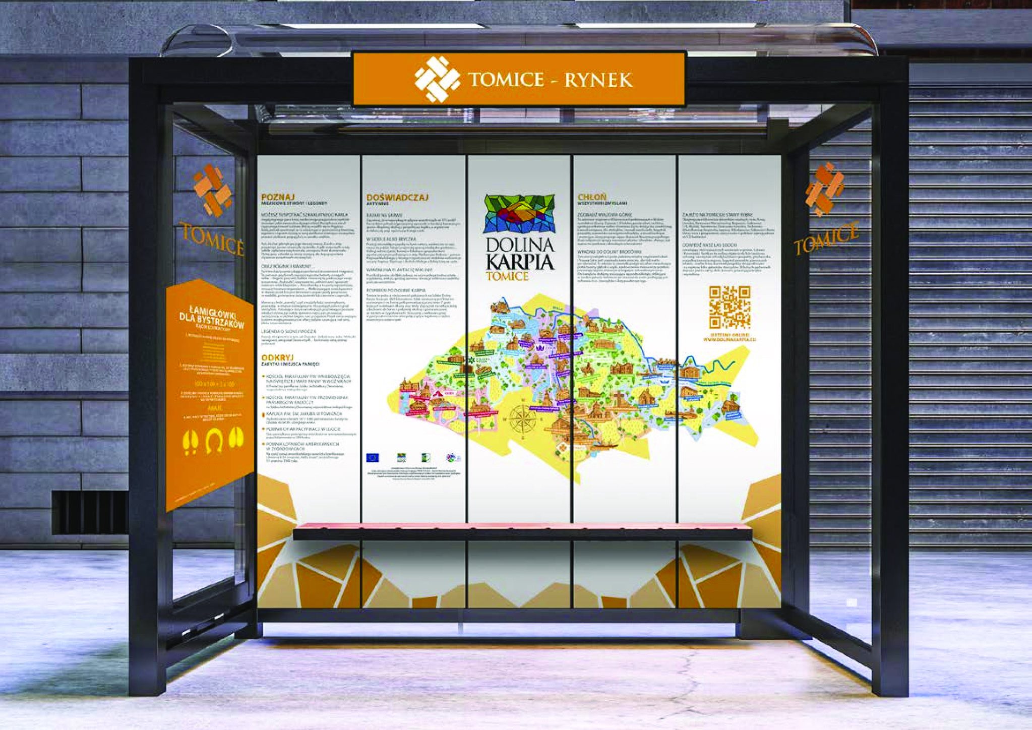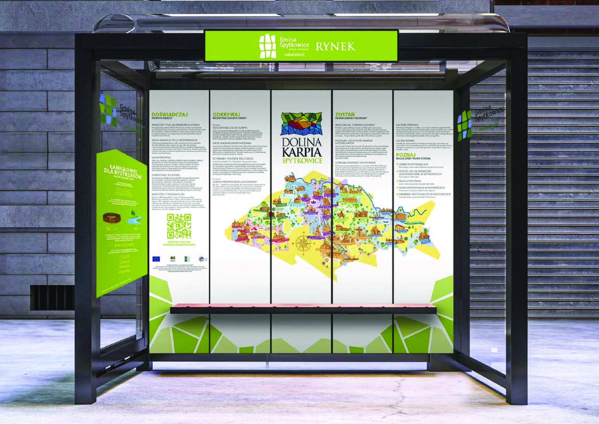 Na każdym przystanku znajdzie się kolorowa mapa Doliny Karpia z zaznaczonymi najważniejszymi obiektami turystycznymi, teksty dotyczące zabytków, przyrody, tradycji naszego regionu a także lokalnych atrakcji oraz łamigłówki dla dzieci. Wszystko zgodnie z Systemem Identyfikacji Wizualnej Doliny Karpia.
