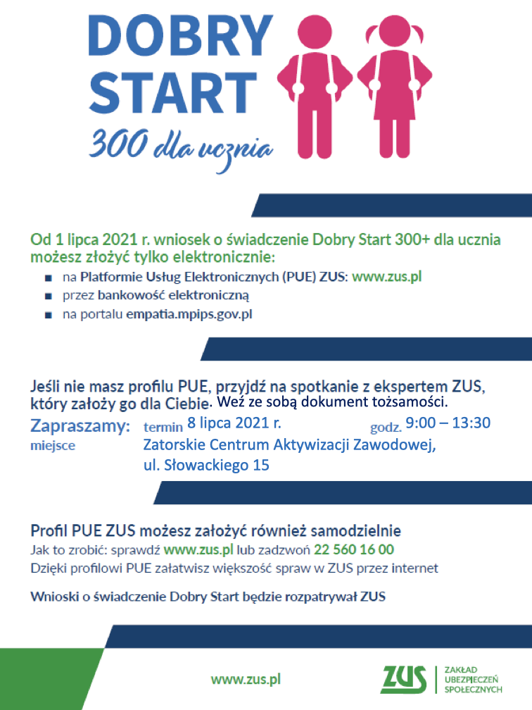 W czwartek (8 lipca) w Zatorskim Centrum Aktywizacji Zawodowej stanie mobilny punkt ZUS. Eksperci pomogą w założeniu profilu na PUE i poprawnym złożeniu wniosku o świadczenie 300+ w ramach programu „Dobry Start”.