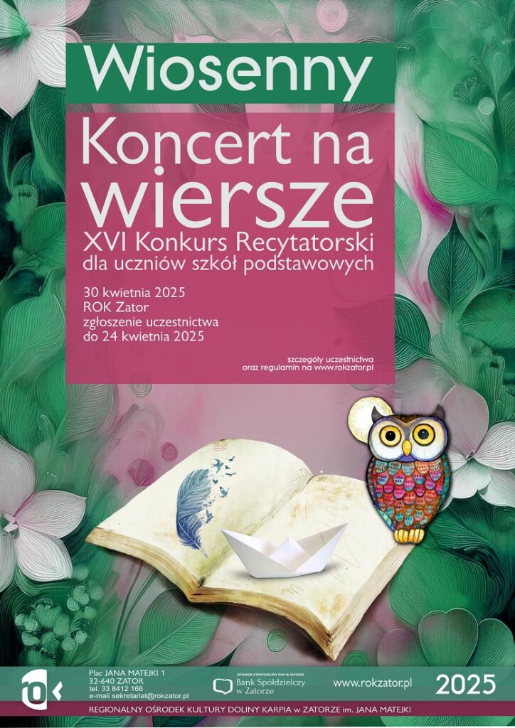 Regionalny Ośrodek Kultury w Zatorze organizuje: XVII Koncert na wiersze – konkurs recytatorski dla uczniów szkół podstawowych z terenu Gminy Zator dnia 30 kwietnia 2025 r.,