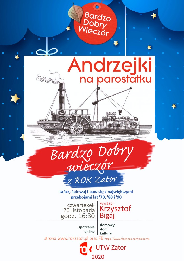 - REKLAMA - Strona głównaKultura #ZATOR ROK Parostatkiem w andrzejkowy rejs. 25 listopada 2020 158 0 Musisz przeczytać #SMOLICE Jutrzejsze przerwy w dostawie prądu 26 stycznia 2026 Bilet za złotówkę dla uczniów z małopolski w czasie ferii 26 stycznia 2026 #RUDZE Jutrzejsze przerwy w dostawie prądu 28 stycznia 2026 Podlodowe zawody wędkarskie 27 stycznia 2026 - REKLAMA - W czwartek, 26 listopada o 16.30 Krzysztof Bigaj zabierze Was parostatkiem w andrzejkowy rejs. Zapraszamy na kolejne spotkanie online w naszym cyklu „Bardzo dobry wieczór z ROK Zator”. Info: ROK Zator Tagiandrzejkowy rejsbardzo dobry wieczórrok zatorspotkanie online Poprzedni artykuł#ZATOR ROK Najsłynniejsza muzyczna krowa świata. Posłuchamy opowieści o okładkach płyt.Następny artykułJodła Kaukaska – spełnij marzenie o żywej choince. KUP CHOINKĘ ON-LINE - REKLAMA - Popularne Piosenki Ewy Demarczyk na scenie w Domu Kultury w Przeciszowie 29 stycznia 2026 Widowisko teatralne – pastorałka Leona Schillera w Przeciszowie 7 stycznia 2026 Wino, kobiety i śpiew czyli Operetkowy Koncert Noworoczny 7 stycznia 2026 ZOSTAW ODPOWIEDŹ Anuluj odpowiedź Komentarz: Proszę wpisać swój komentarz! Nazwa:* Proszę podać swoje imię tutaj E-mail:* Wpisałeś nieprawidłowy adres e-mail! Wpisz tutaj swój adres e-mail Strona Internetowa: Zapisz moje nazwisko, adres e-mail i stronę internetową w tej przeglądarce na następny raz, gdy skomentuję. Δ Zator zachmurzenie duże enter location -1.1 ° C -1 ° -1.1 ° 88 % 6kmh 100 % pt. 2 ° sob. -4 ° niedz. -6 ° pon. -7 ° wt. -7 ° - REKLAMA -