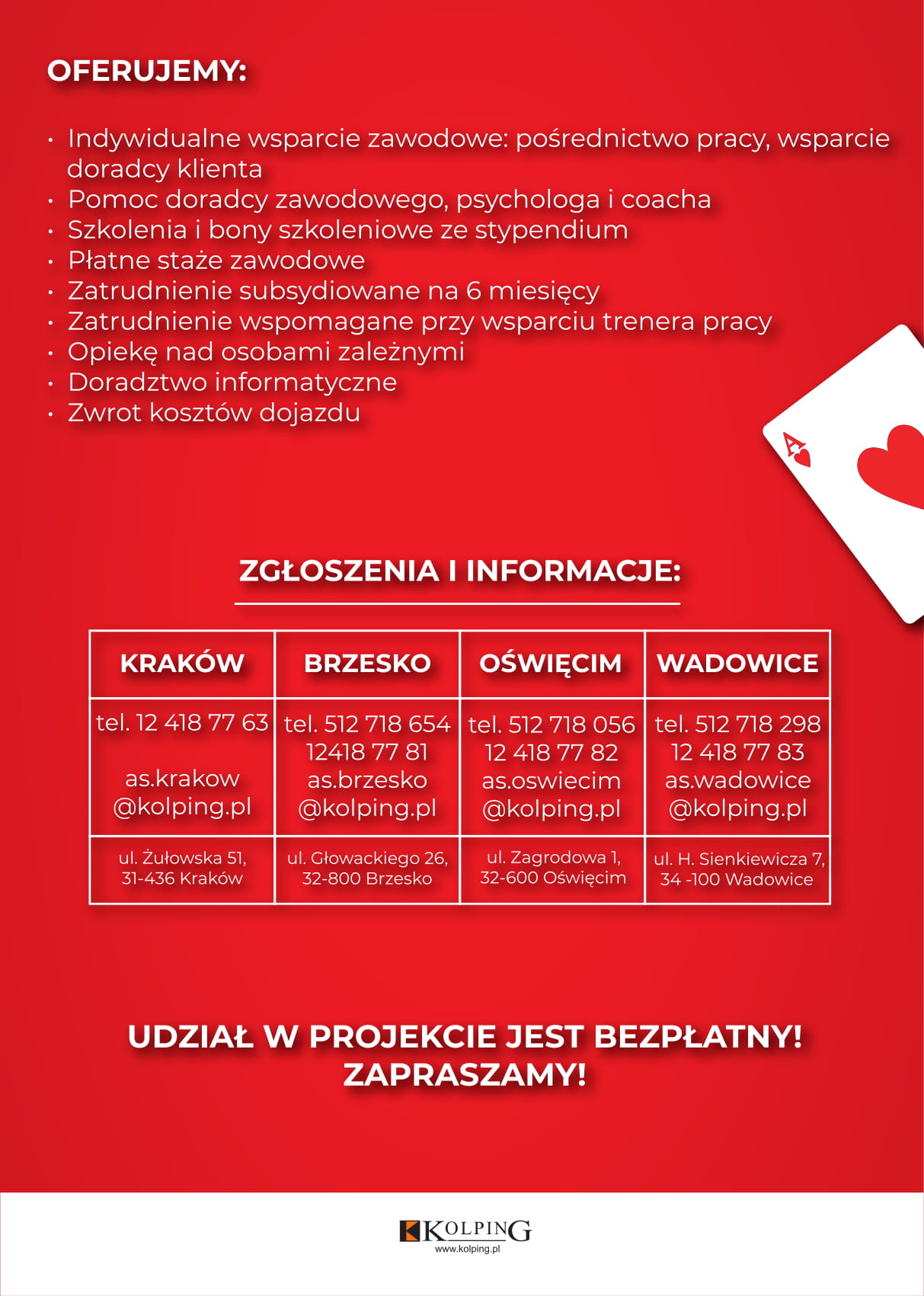 Rekrutacja jest prowadzona w Centrach Wsparcia Kolping, które funkcjonują na terenie Krakowa, Brzeska, Oświęcimia i Wadowic. Osoby zainteresowane projektem proszone są o kontakt