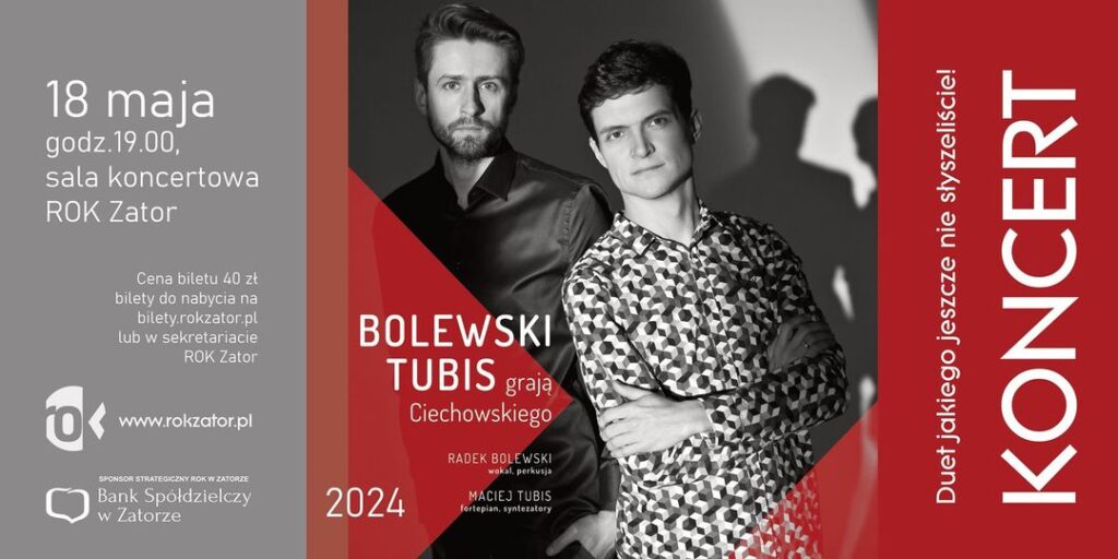 Radosław Bolewski (wokal, perkusja) oraz Maciej Tubis (fortepian i syntezator basowy) to oryginalny i wyjątkowy duet. Ich muzyka jest mieszanką jazzu i popu w odważnej improwizowanej odsłonie. Świetnie odnajdują się w autorskim repertuarze, ale na koncie mają również doskonale przyjęty projekt „Obywatel Jazz” poświęcony twórczości Grzegorza Ciechowskiego. Jego dorobek w ujęciu duetu zyskuje współczesne i fascynujące ujęcie. I właśnie repertuar byłego lidera Republiki będzie główną częścią ich występu w Scenie na Piętrze. Bolewski i Tubis koncertują z „czarno-białym” repertuarem od 2021 roku. O randze projektu świadczy jego prezentacja m.in. w Radio 357 oraz podczas Dni Grzegorza Ciechowskiego w Toruniu.