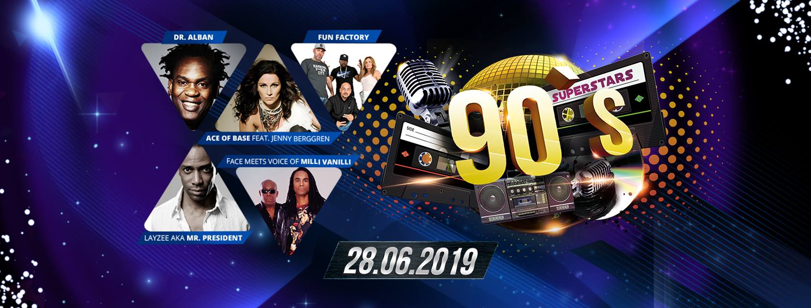 Pierwszego dnia (piątek) podczas 90’s Superstars Festival powrócimy do epoki kaseciaków, a w zasadzie tego, co się na nich słuchało. Wśród przebojów tamtych lat obowiązkowo wymienić należy „It’s My Life” Dr. Albana, którego tego dnia na pewno zobaczymy. Formacja, którą do dziś możemy usłyszeć w wielu stacjach radiowych to Ace Of Base. Ich „Beautiful Morning” powoduje, że nie tylko poranek, ale i cały dzień może stać się naprawdę piękny! Jeszcze piękniejsze będą przeżycia pod sceną, bowiem wystąpi na niej także Layzee Aka – frontmen zespołu MR. President. No to „Coco Jambo” i do przodu! Bo to nie koniec muzycznych doznań na 28 czerwca. Piątkową noc rozjaśnią swym blaskiem Fun Factory – kolektyw, który nie bazuje wyłącznie na swoich wielkich hitach z lat 90-tych, lecz tworzy coraz to nowsze przeboje.