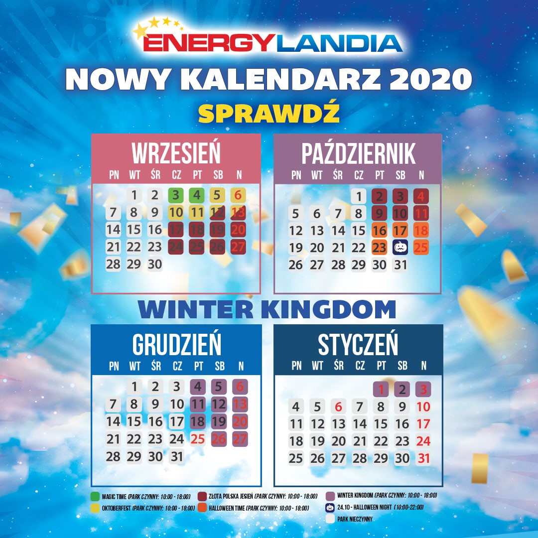 W październiku i grudniu Energylandia czynna jest od piątku do niedzieli od 10:00 do 18:00! Dokładny kalendarz dostępny jest na stronie internetowej: https://energylandia.pl/zaplanuj-pobyt/kalendarz/